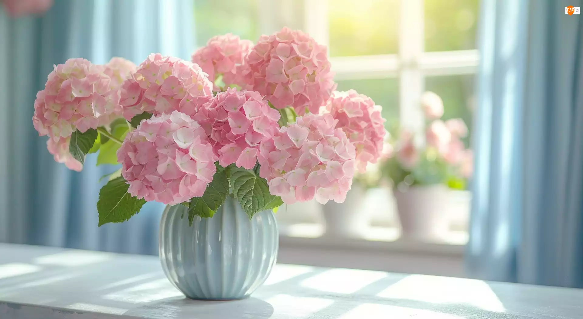 Hortensje, Okno, Różowe, Kwiaty, Wazon