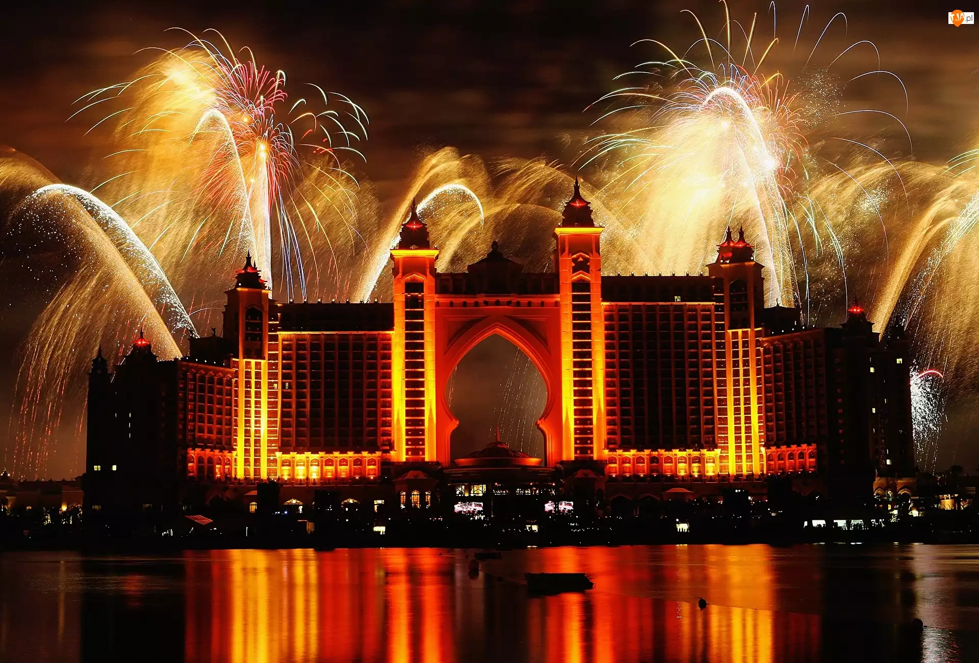 Hotel, Noc, Oświetlone, Sztuczne ognie