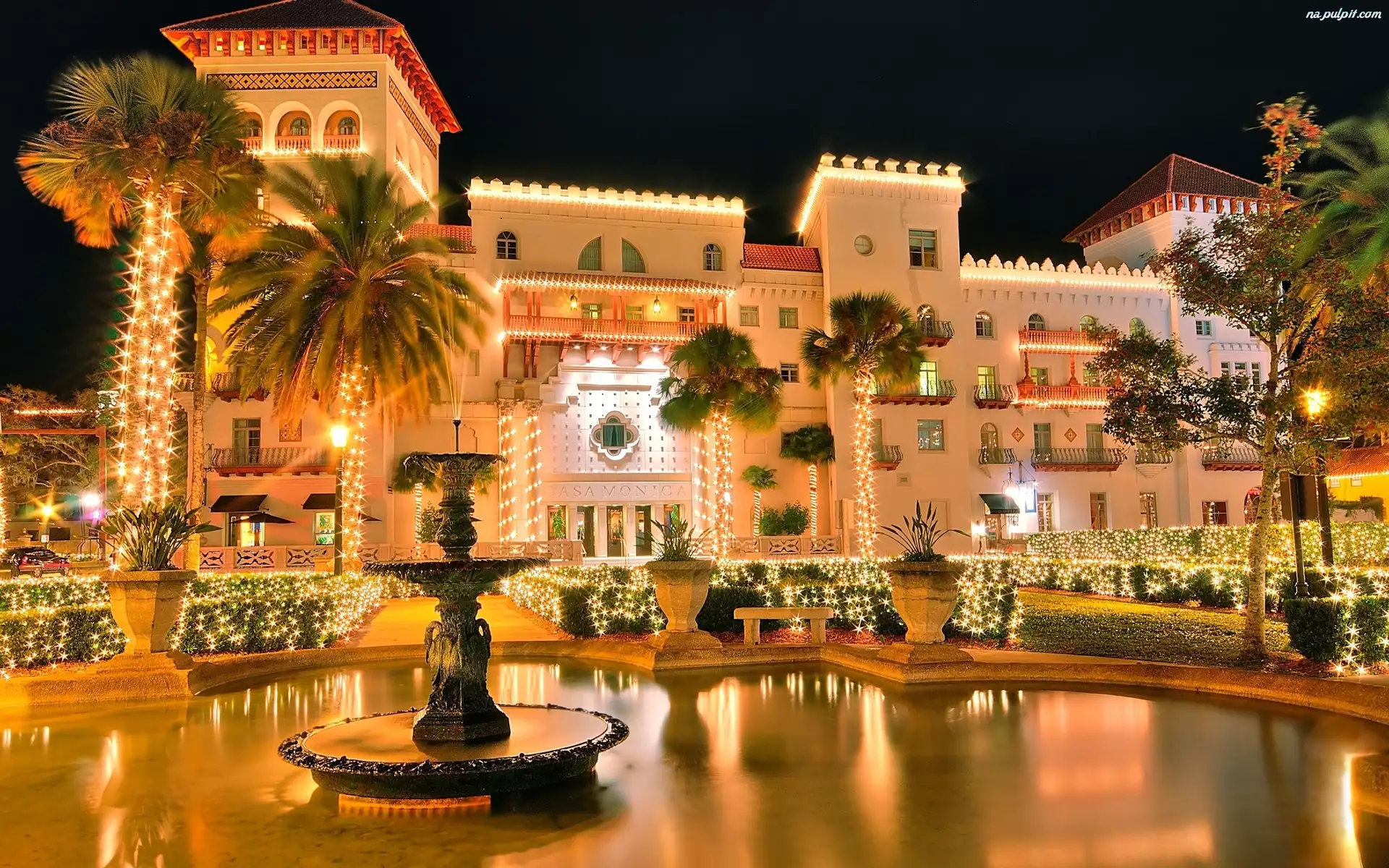 Hotel, Światełka, Fontanna, Palmy