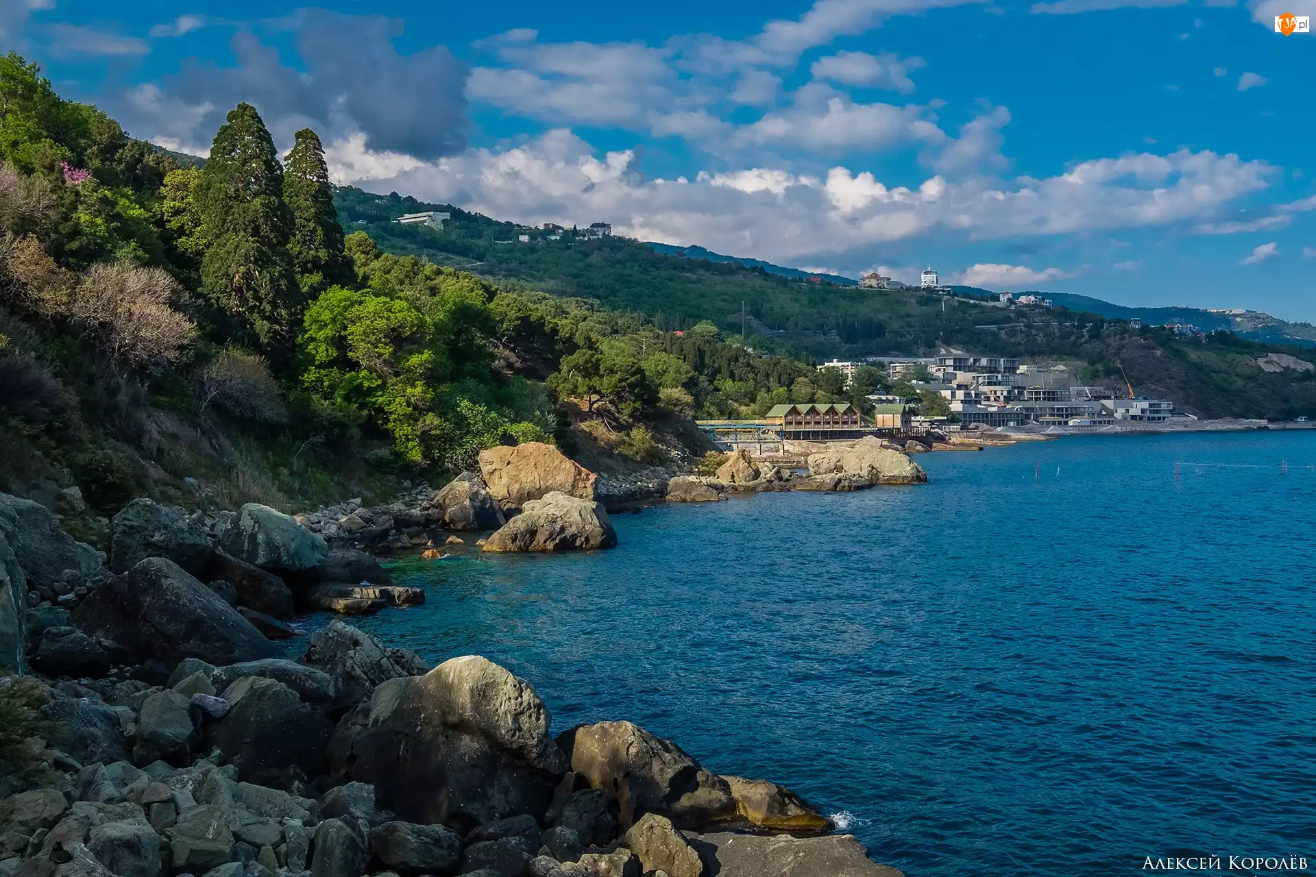 Drzewa, Morze Czarne, Głazy, Ałupka, Wybrzeże, Domy, Krym, Kamienie