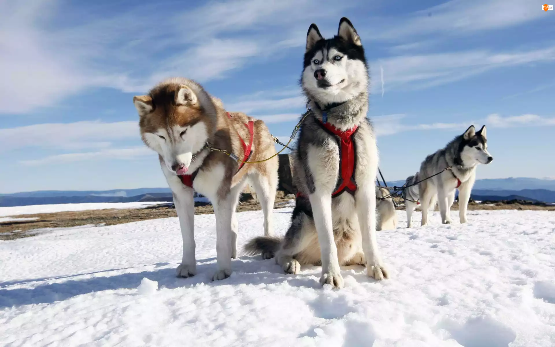 Husky, Psy, Sanie, Zima, Zaprzeg, Góry