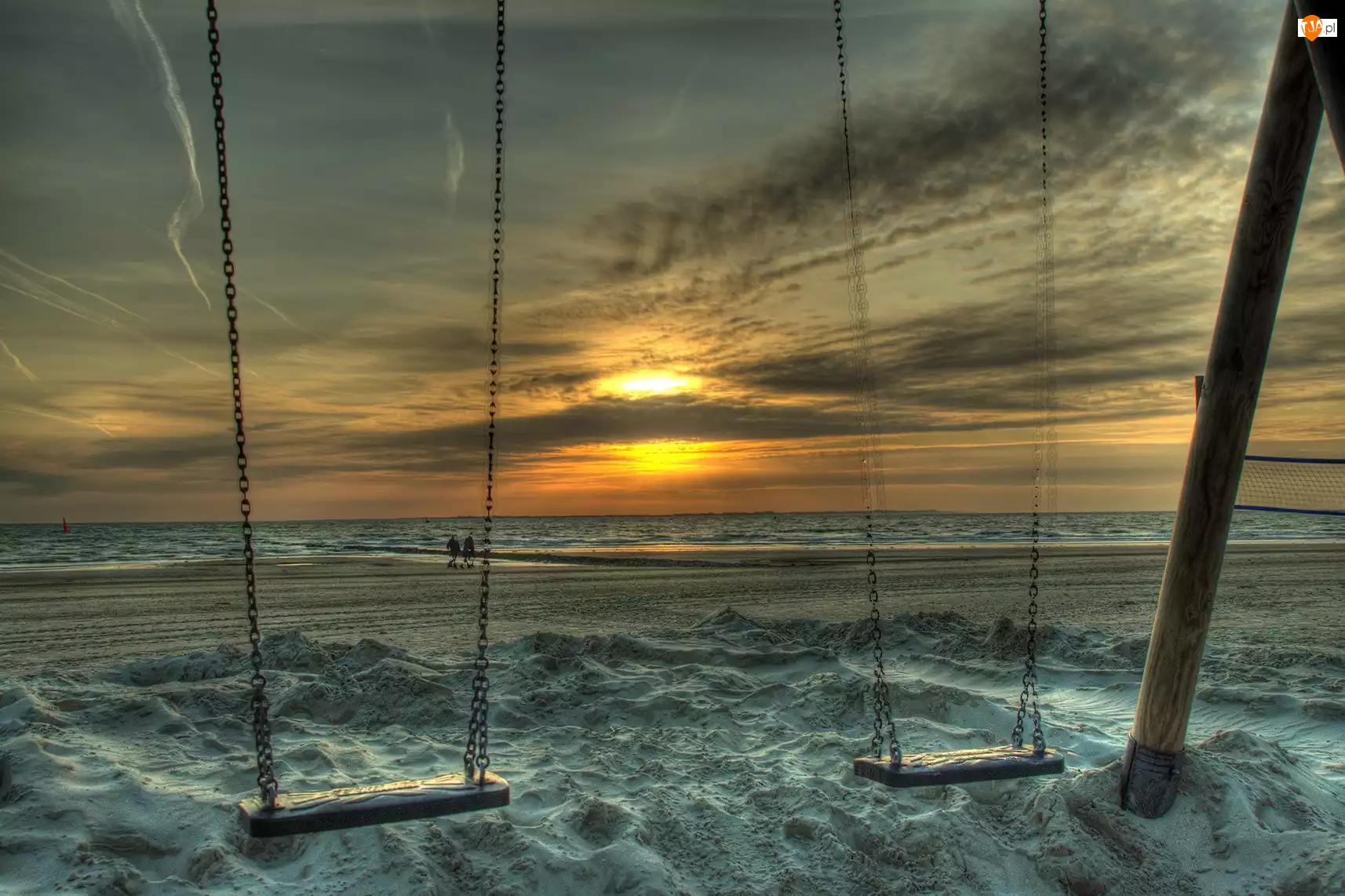 Huśtawki, Morze, Zachód, Plaża, Słońca
