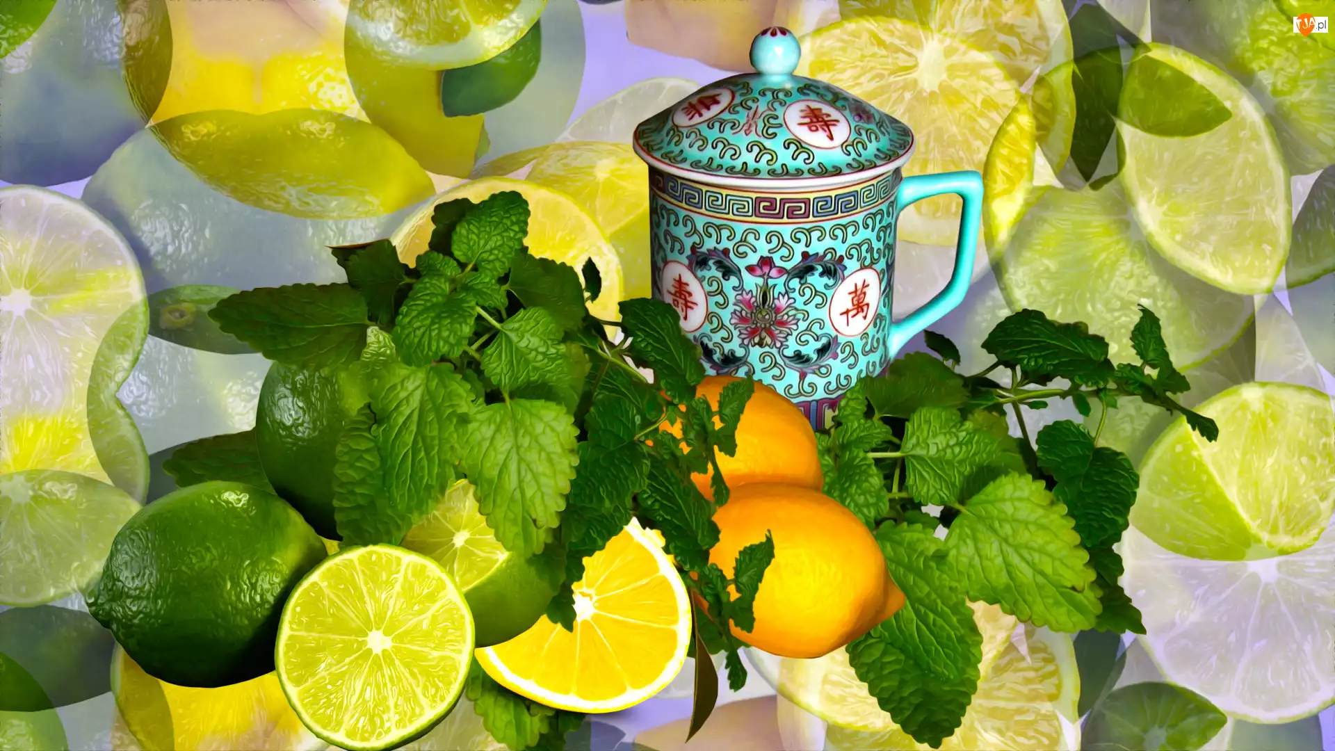 Limonki, Mięta, Grafika, Cytryny, Zaparzacz, Przykrywka, Kubek