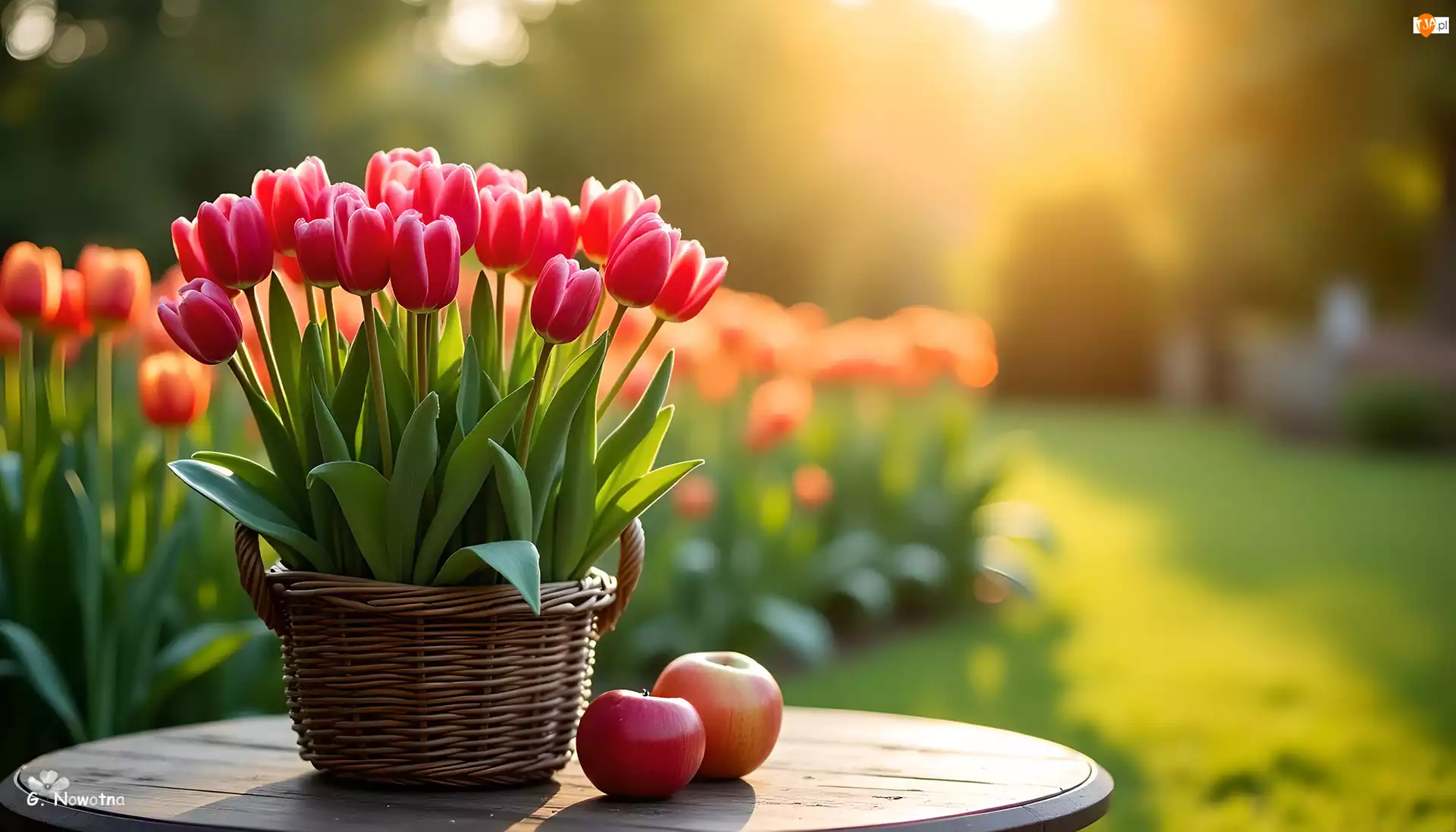 Jabłka, Grafika, Koszyk, Tulipany, Stolik