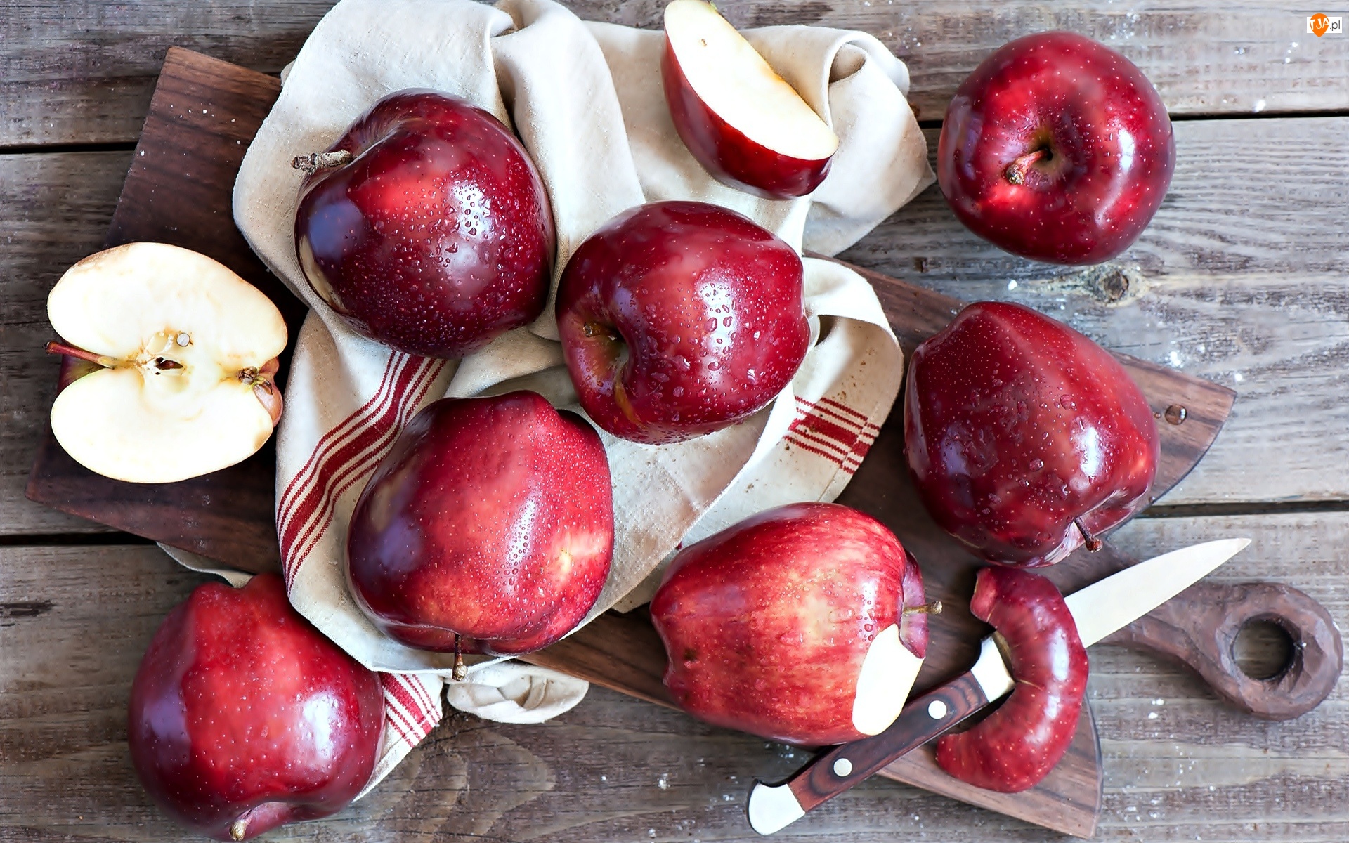 Jabłka, Nóż, Deska, Ścierka
