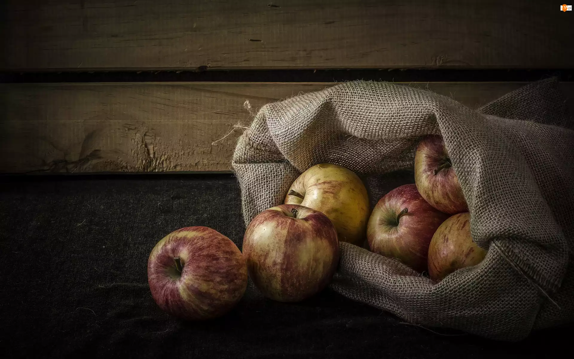 Jabłka w worku na deskach