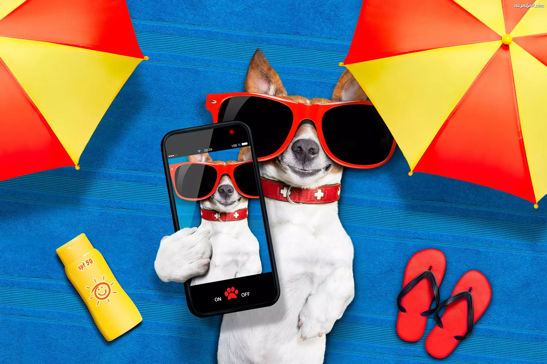 Okulary, Jack Russell terrier, Parasole, Wakacje, Telefon, Śmieszne