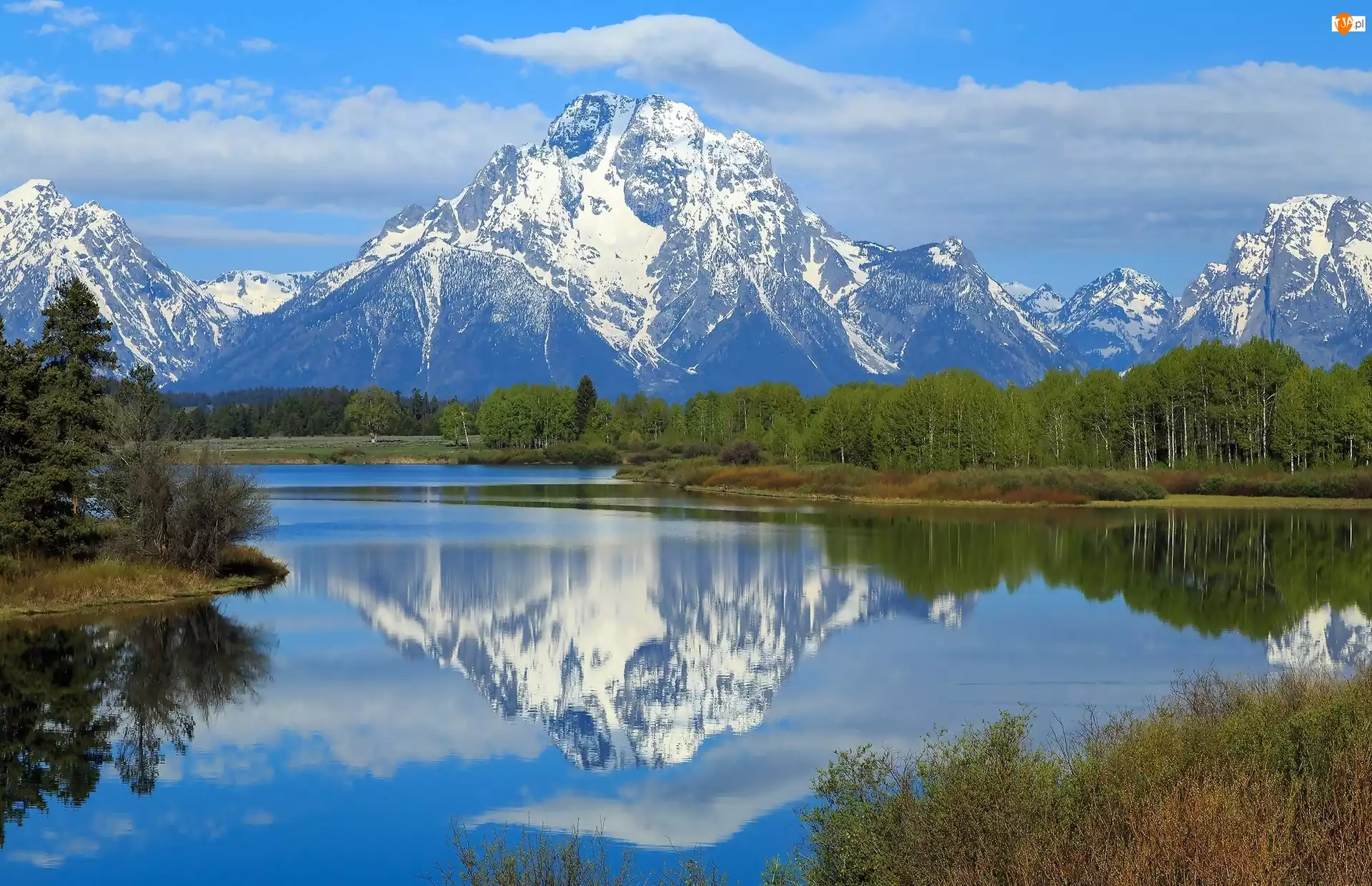 Szczyt Mount Moran, Stany Zjednoczone, Rzeka Snake River, Drzewa, Stan Wyoming, Góry, Odbicie, Park Narodowy Grand Teton