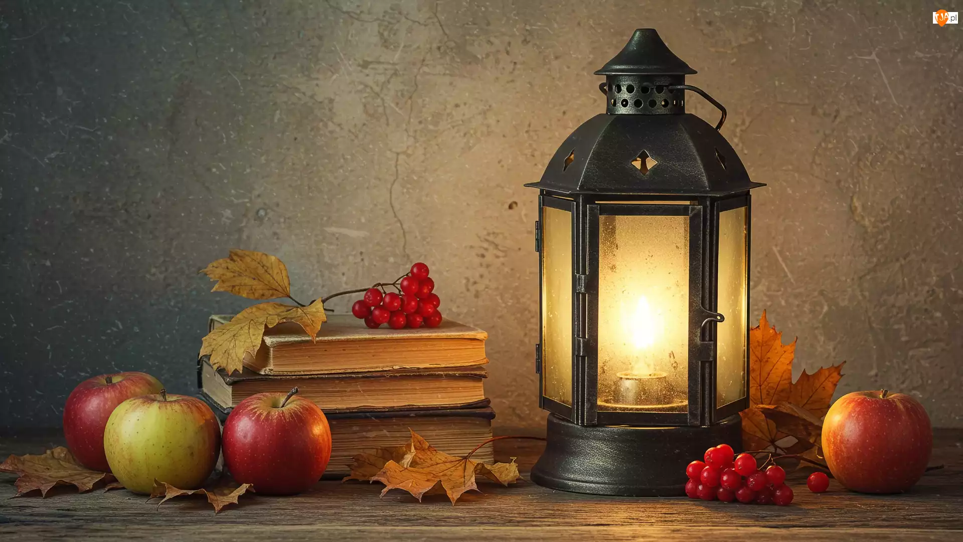 Jagody, Kompozycja, Jabłka, Pożółkłe, Lampion, Czerwone, Liście, Książki