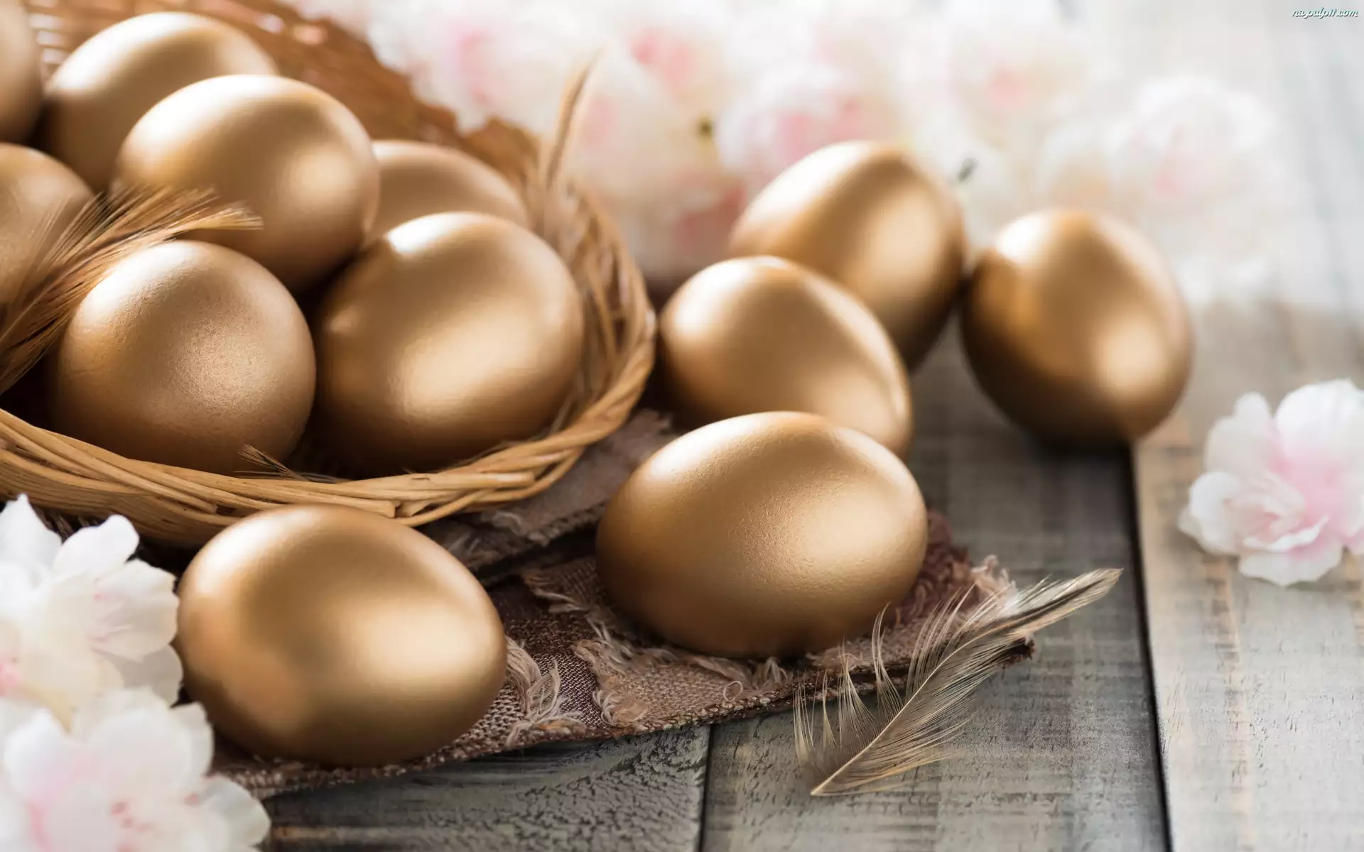 Pisanki, Złote, Kwiaty, Wielkanoc, Koszyk, Deska