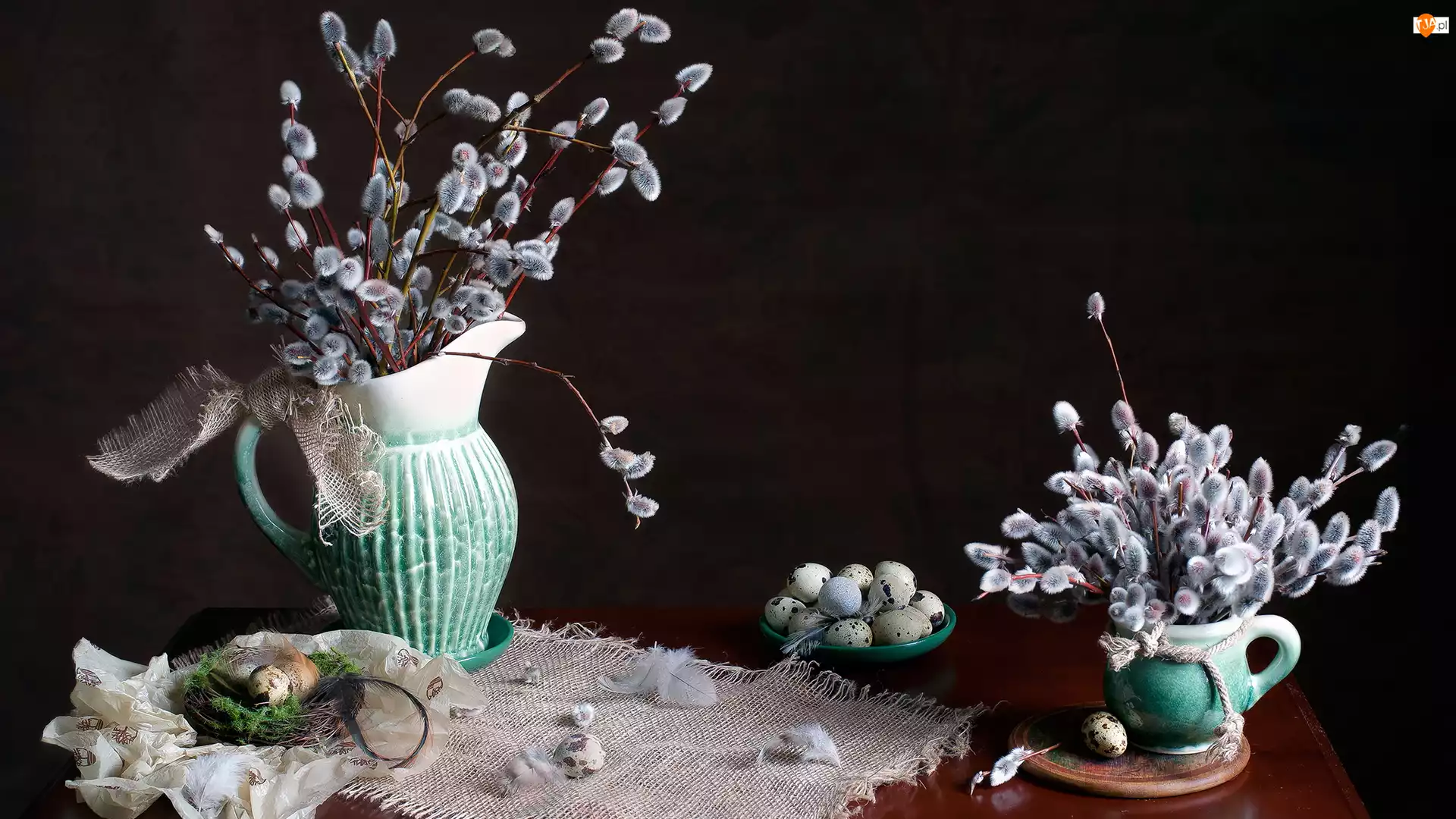 Jajeczka, Zielono-białe, Gniazdko, Kompozycja, Dzbanki, Miseczka, Wielkanoc, Bazie