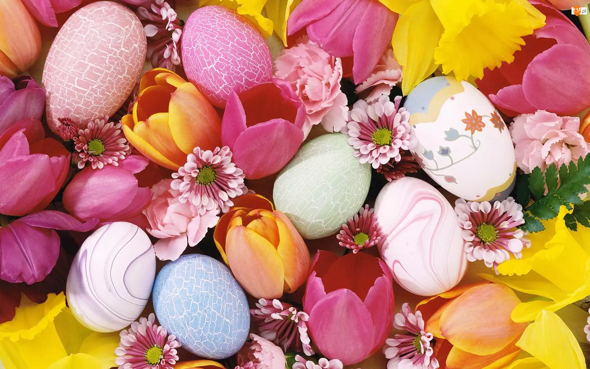 Jajka, Żonkile, Pisanki, Wielkanoc, Tulipany