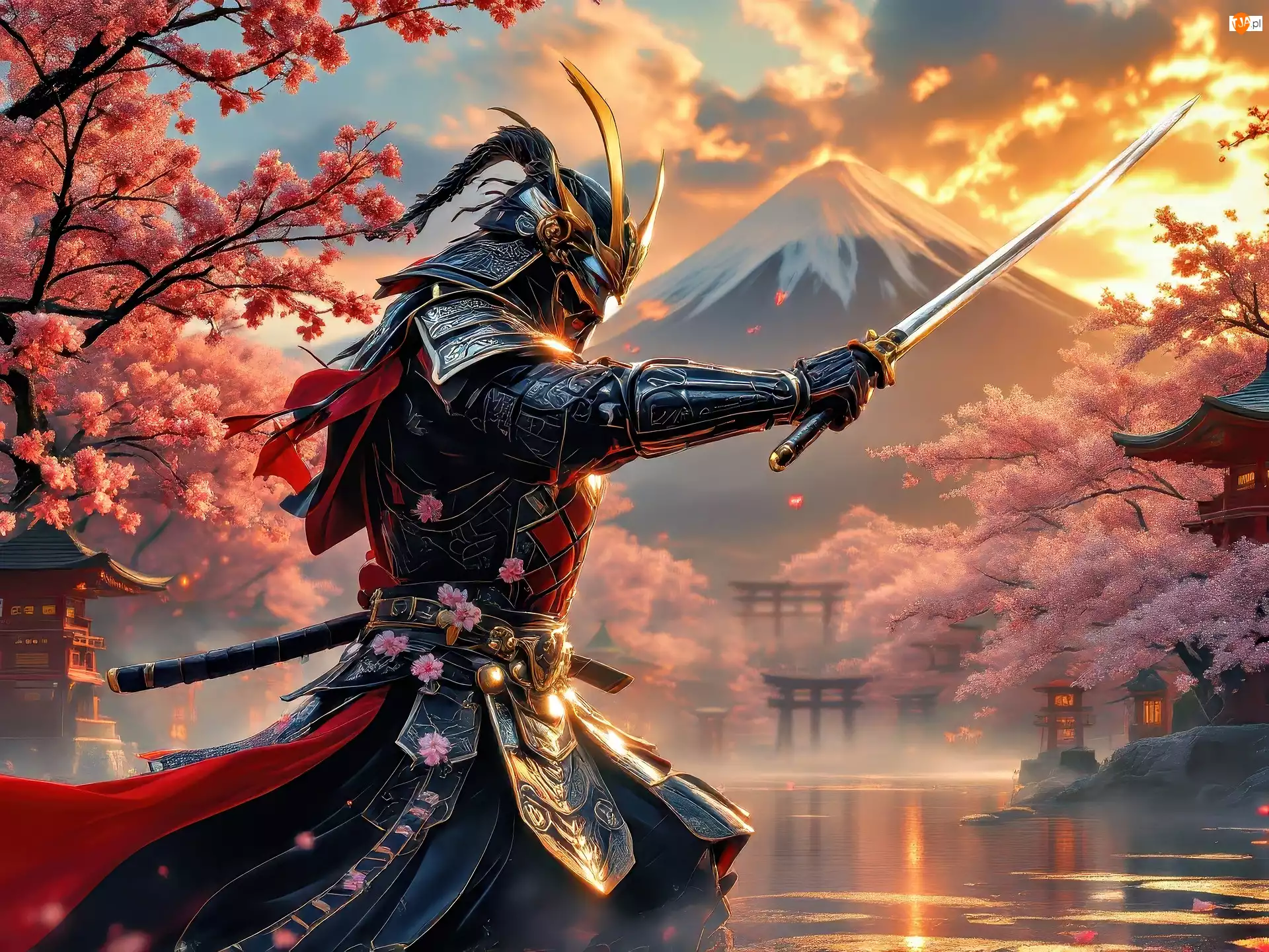 Grafika, Wojownik, Góra, Jezioro, Drzewa, Samuraj, Zbroja, Japoński, Miecz
