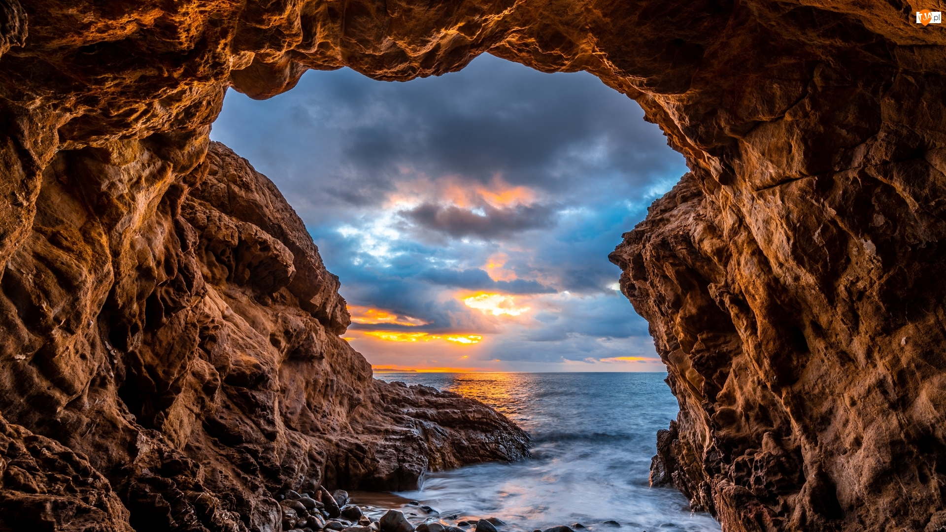 Skały, Zachód słońca, Jaskinia, Morze, Chmury