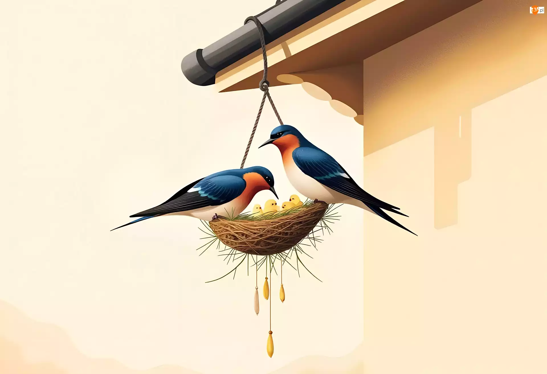 Grafika, Jaskółki, Gniazdo, Dach