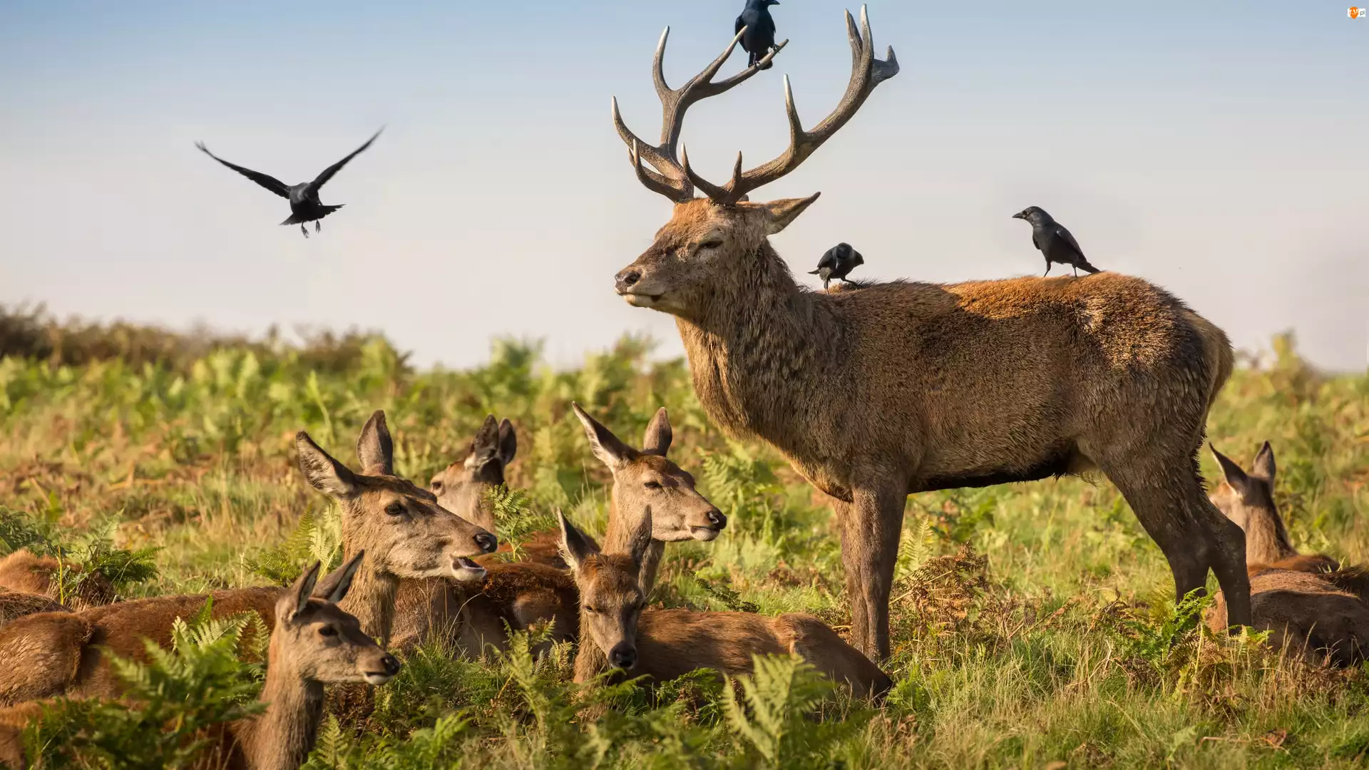 Jeleń, Łąka, Ptaki, Łanie