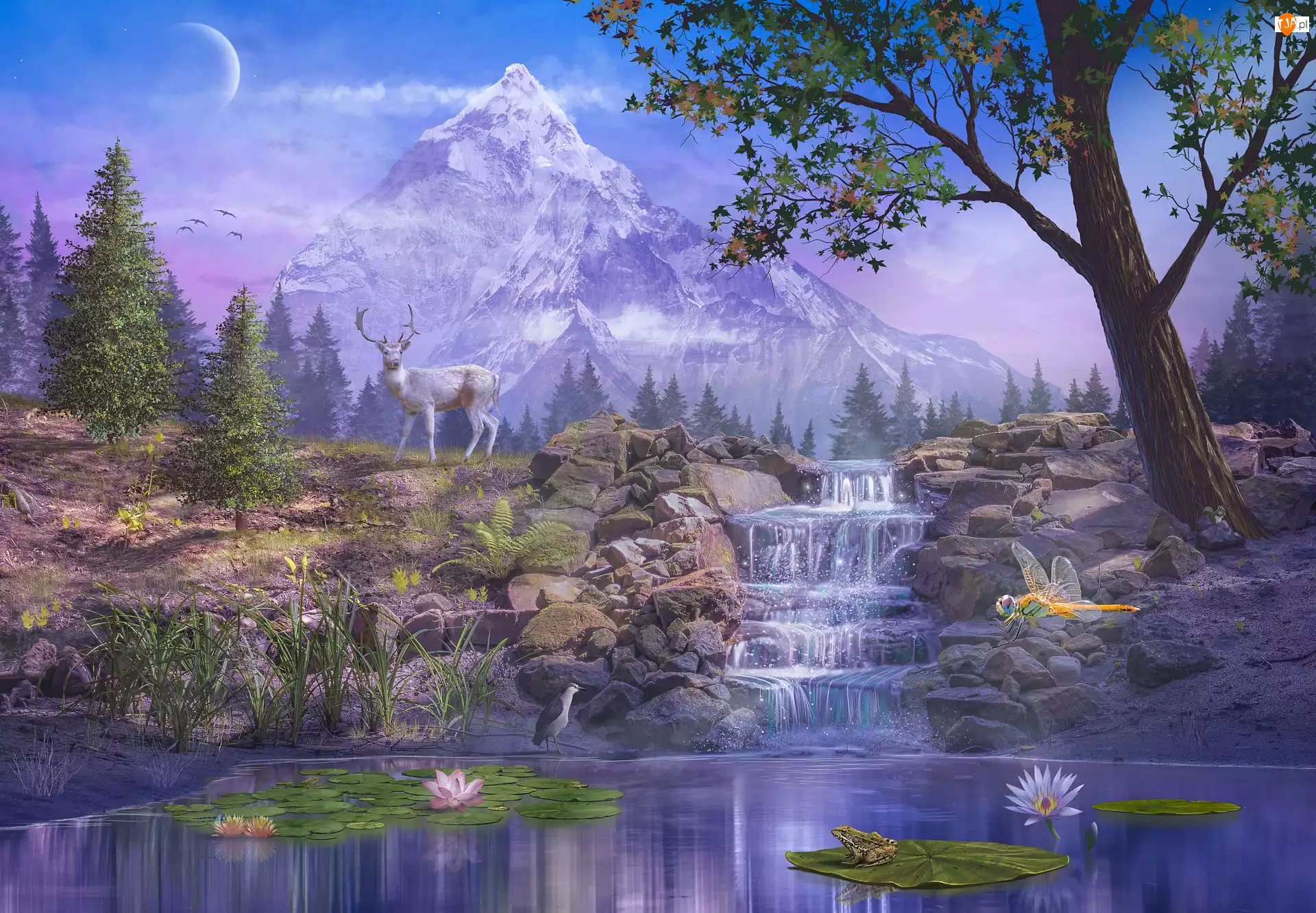 Staw, Wodospad, Jeleń, Fotomontaż, Drzewa, Góry