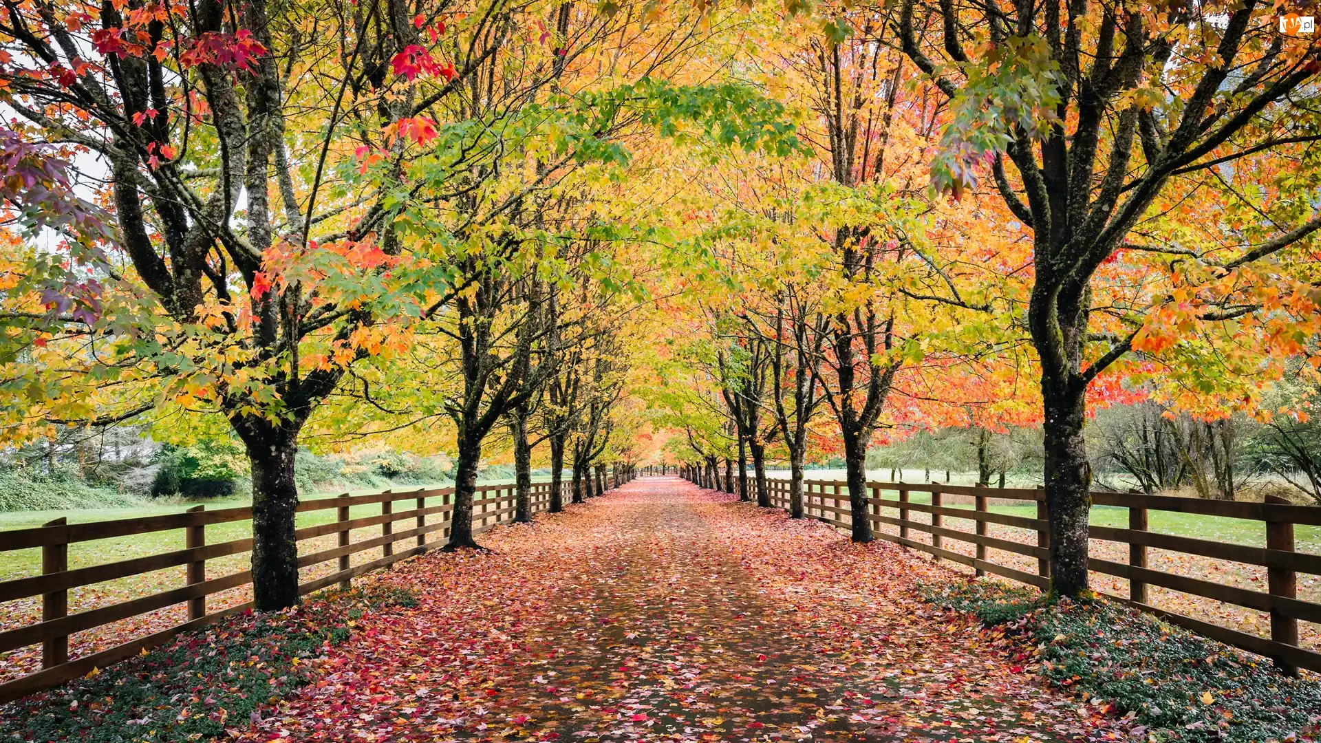 Jesień, Drzewa, Ogrodzenie, Park, Liście, Opadłe, Droga