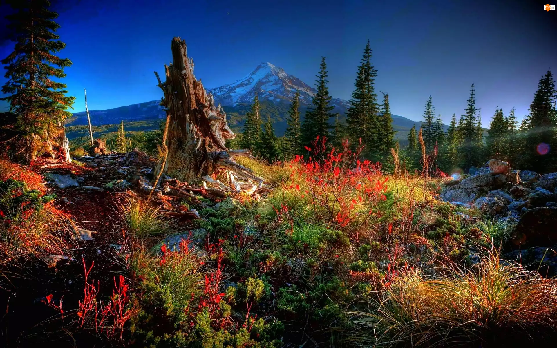 Pień, Jesień, Las, Góry, Trawy