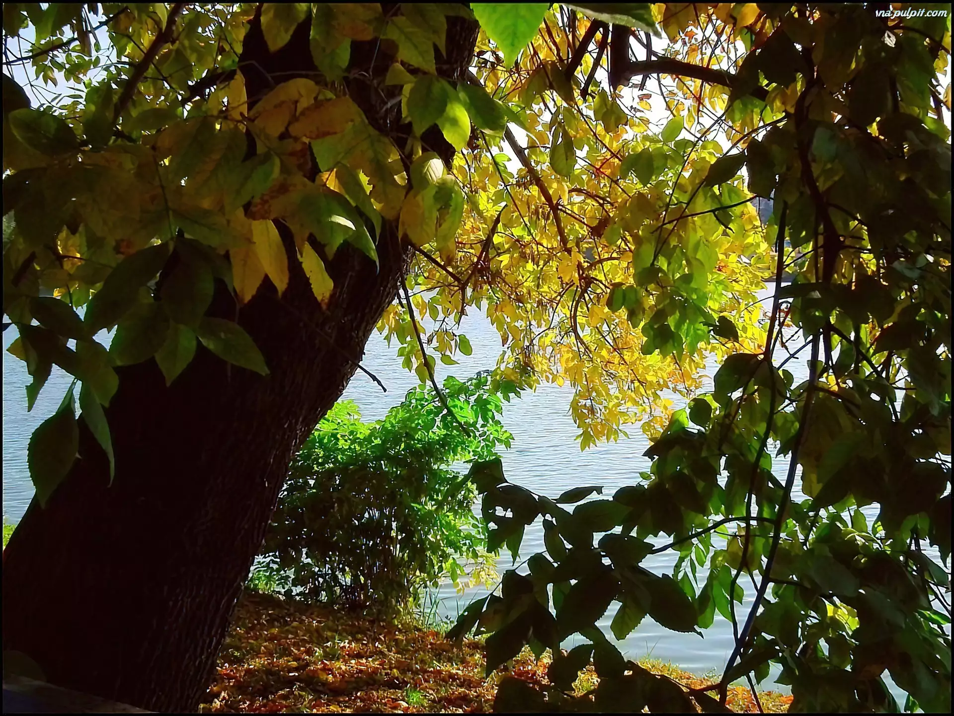Jesień, Jezioro, Drzewa, Liście