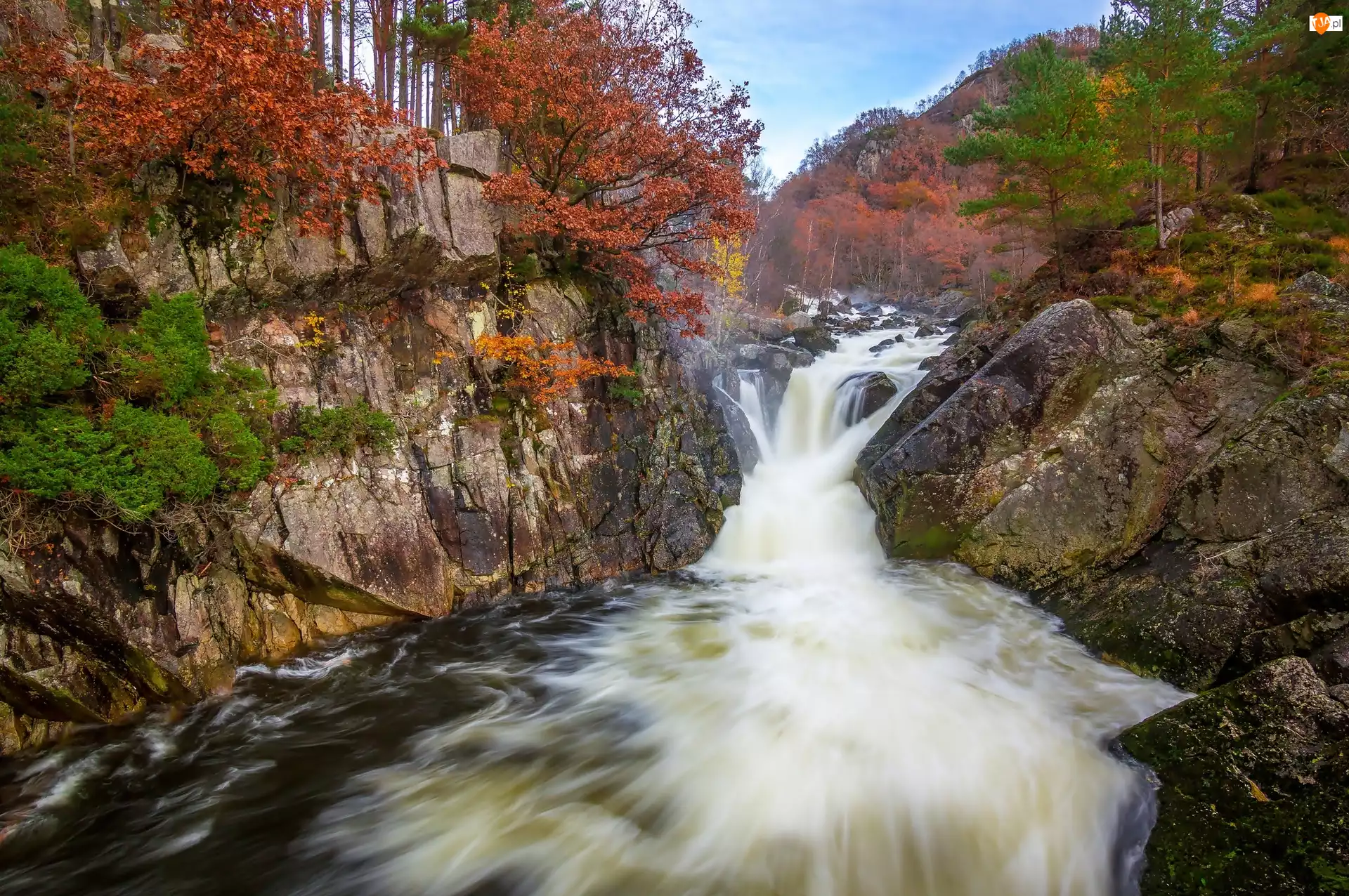 Jesień, Las, Wodospad, Skały