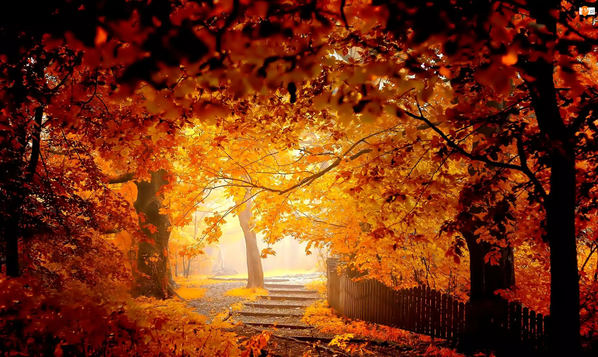 Jesień, Liście, Park, Płotek