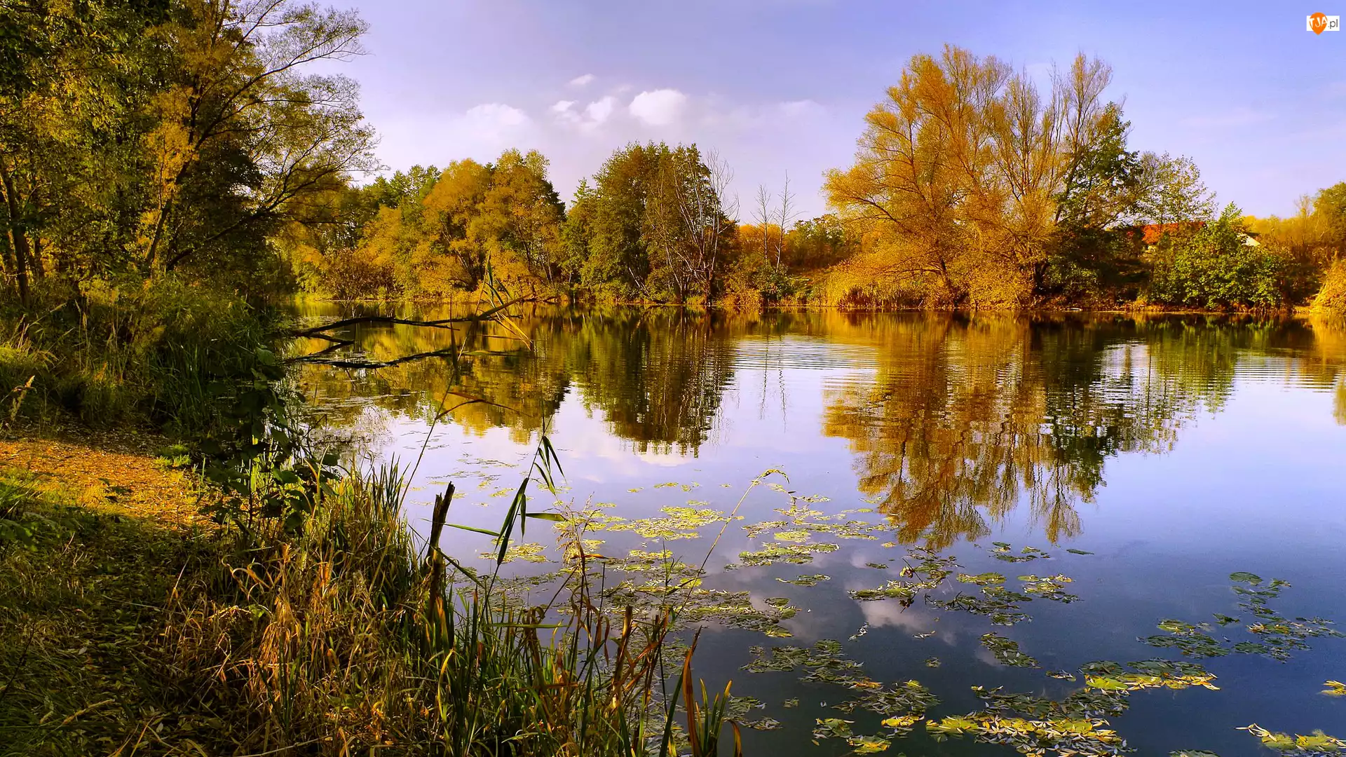 Drzewa, Odbicie, Jezioro, Jesień, Trzciny
