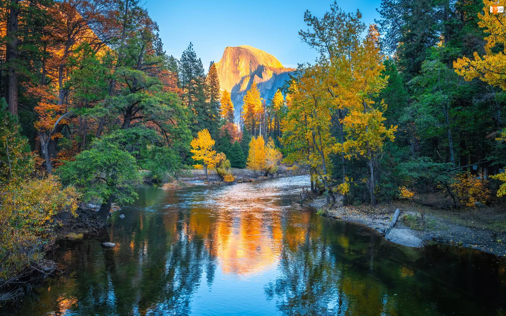 Jesień, Park Narodowy Yosemite, Merced River, Kalifornia, Góra Half Dome, Drzewa, Stany Zjednoczone, Rzeka