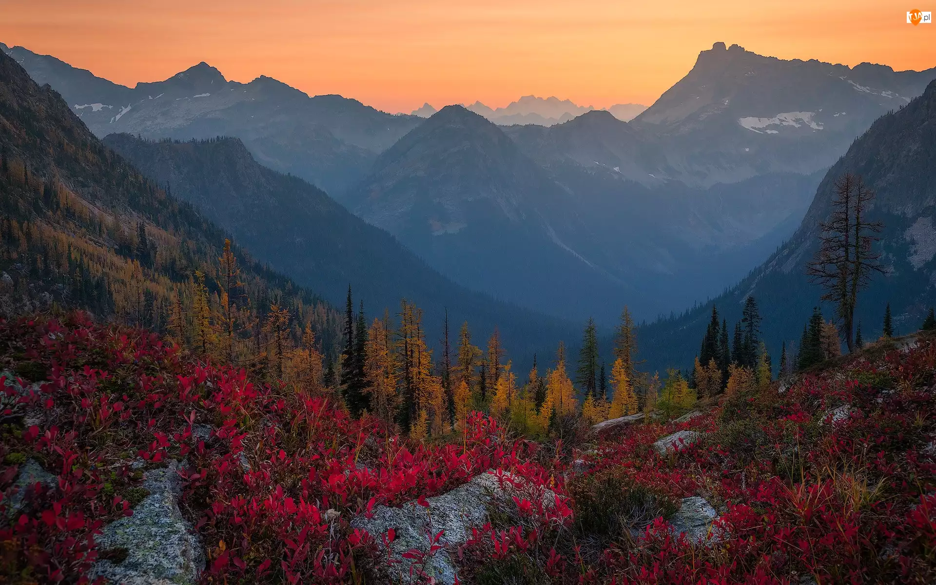 Roślinność, Stan Waszyngton, Kolorowa, Jesień, Skały, Góry Kaskadowe, Park Narodowy Północnych Gór Kaskadowych, Stany Zjednoczone, Drzewa