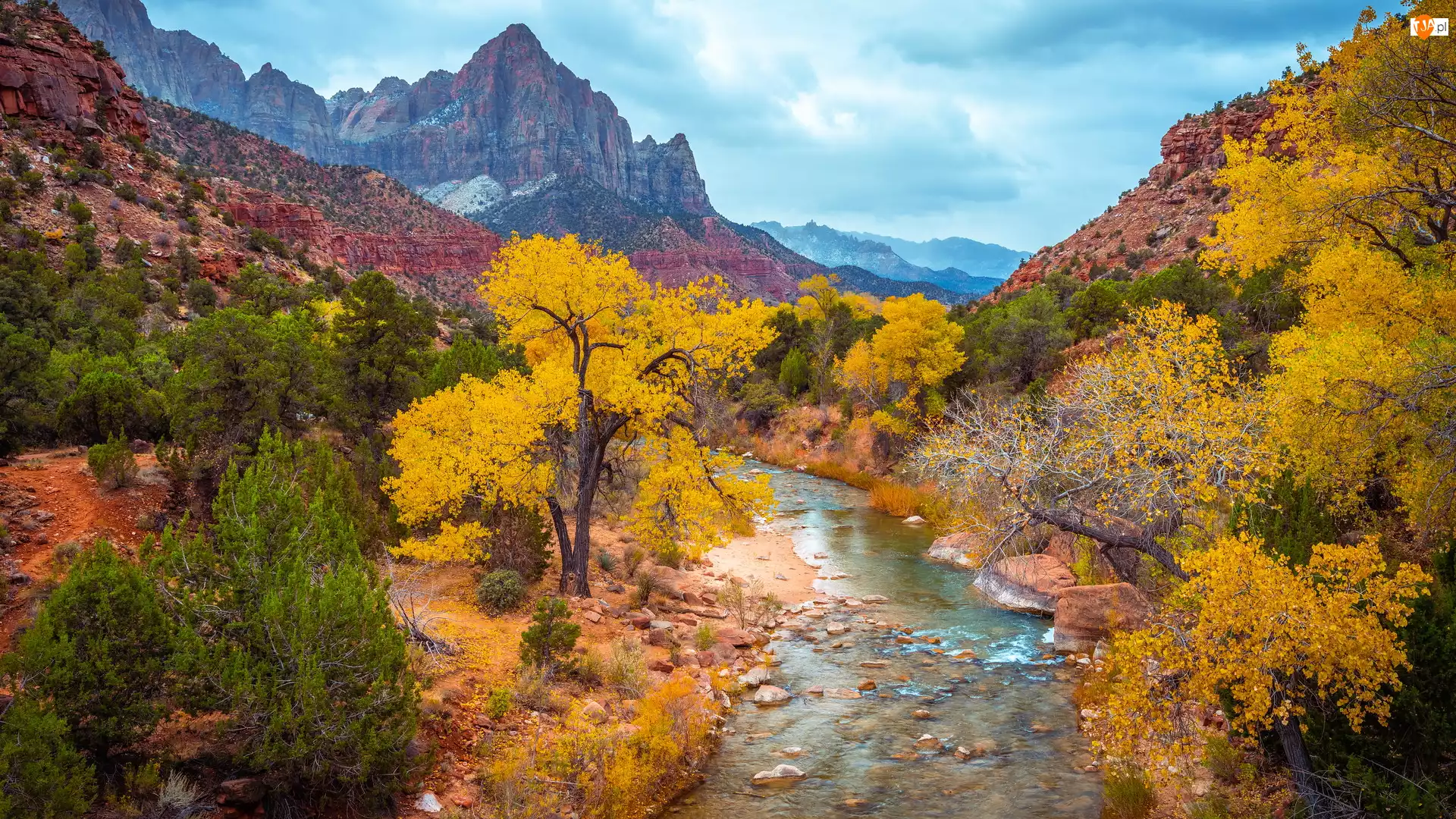 Stany Zjednoczone, Drzewa, Park Narodowy Zion, Kamienie, Góry, Jesień, Rzeka, Góra Watchman, Virgin River, Utah