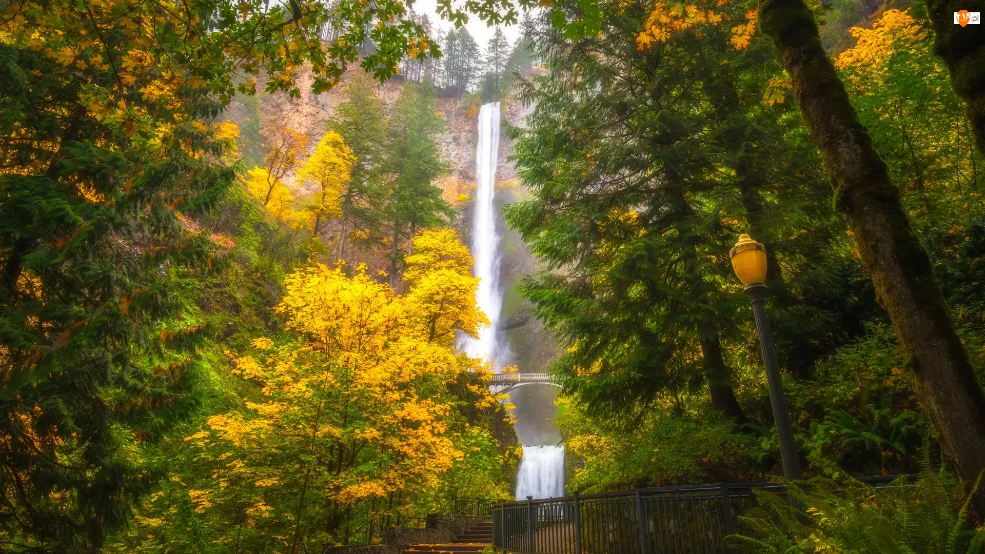 Jesień, Wodospad, Drzewa, Stan Oregon, Multnomah Falls, Latarnia, Stany Zjednoczone, Most