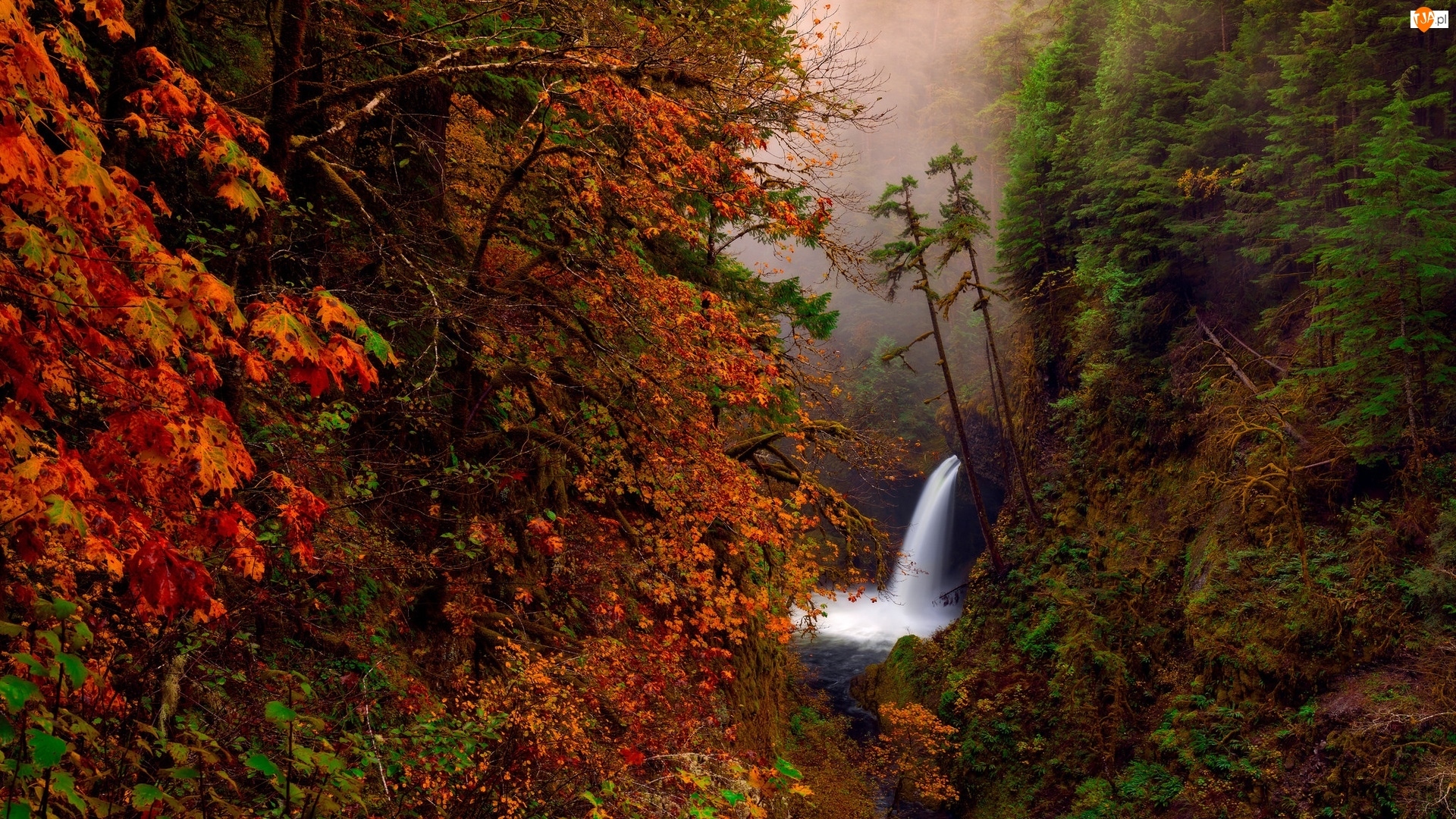 Jesień, Wodospad, Las, Mgła