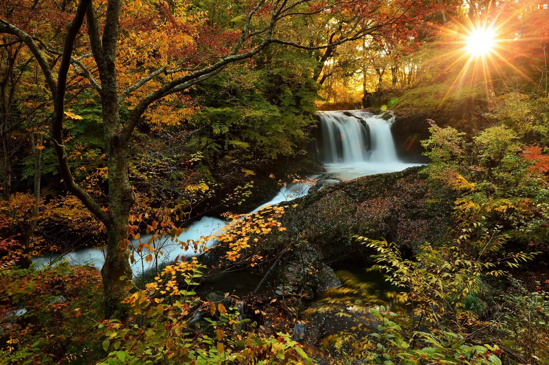 Jesień, Wodospad, Promienie, Las, Słońca