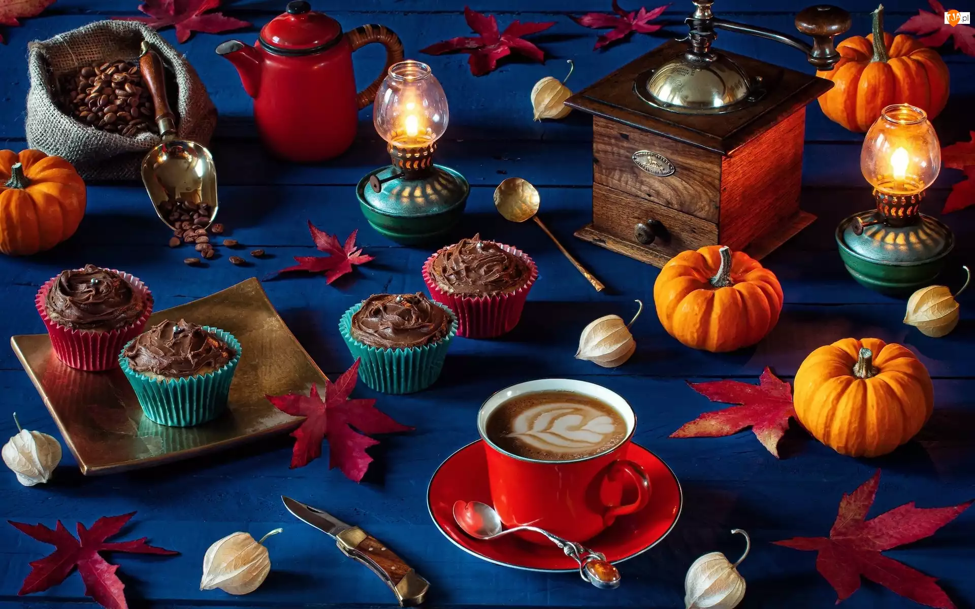 Liście, Zastawa kawowa, Dynie, Kawa, Dzbanek, Młynek, Lampa, Kompozycja, Ciasto