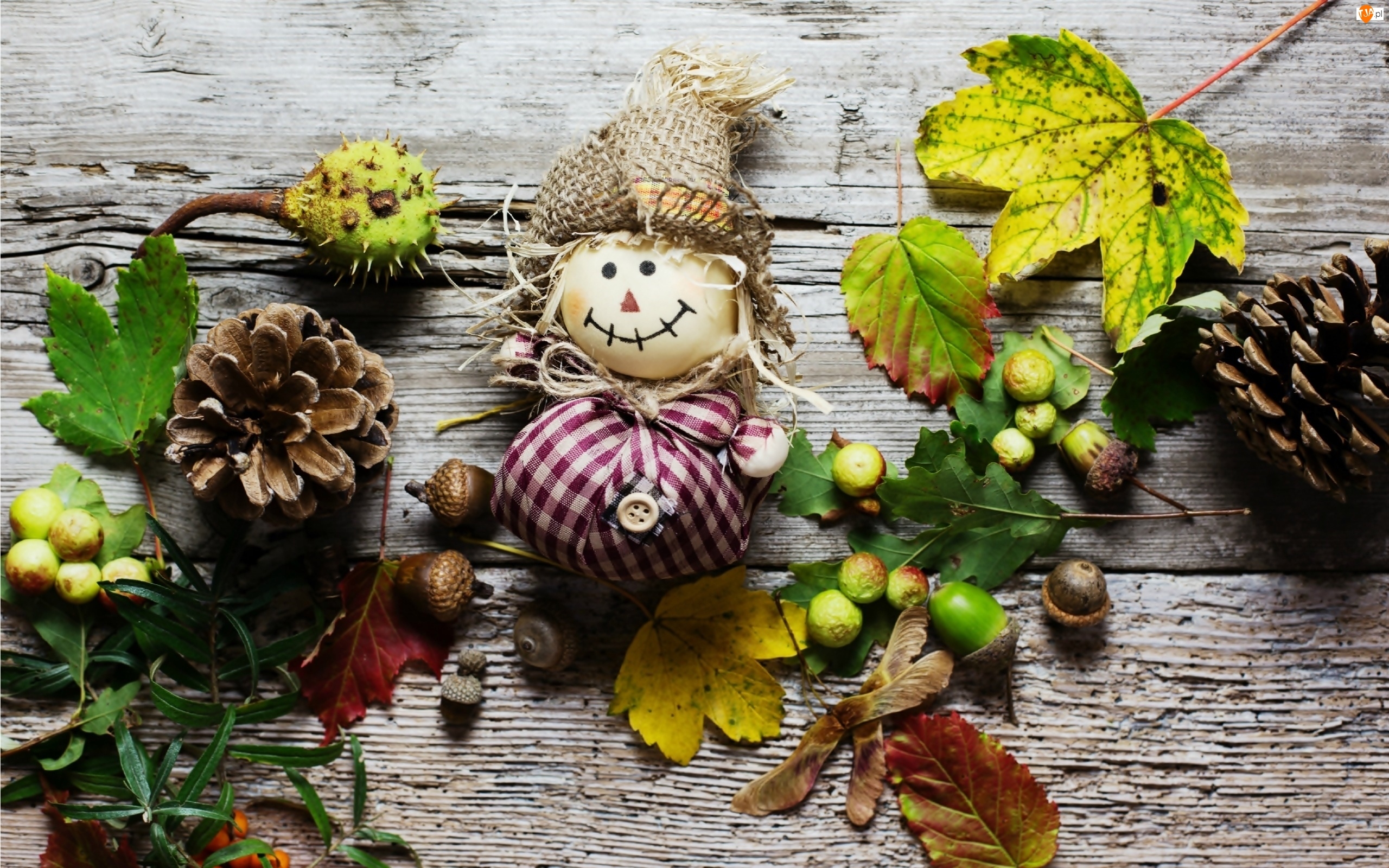Jesienna, Liście, Żołędzie, Szyszki, Kompozycja, Kasztany, Laleczka