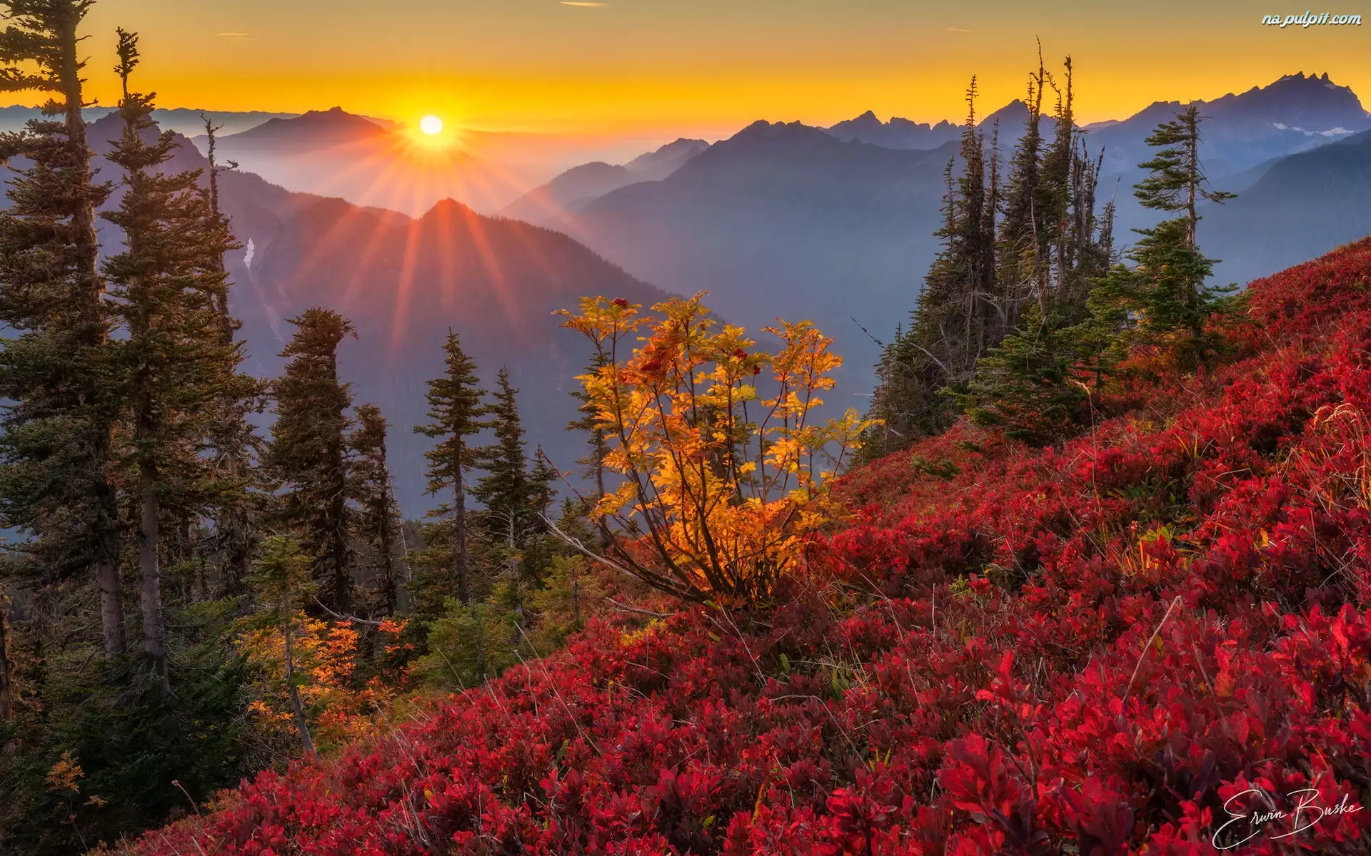 Stany Zjednoczone, Zachód słońca, Stan Wyszyngton, Roślinność, Góry Kaskadowe, Promienie, Drzewa, Jesień, Kolorowa