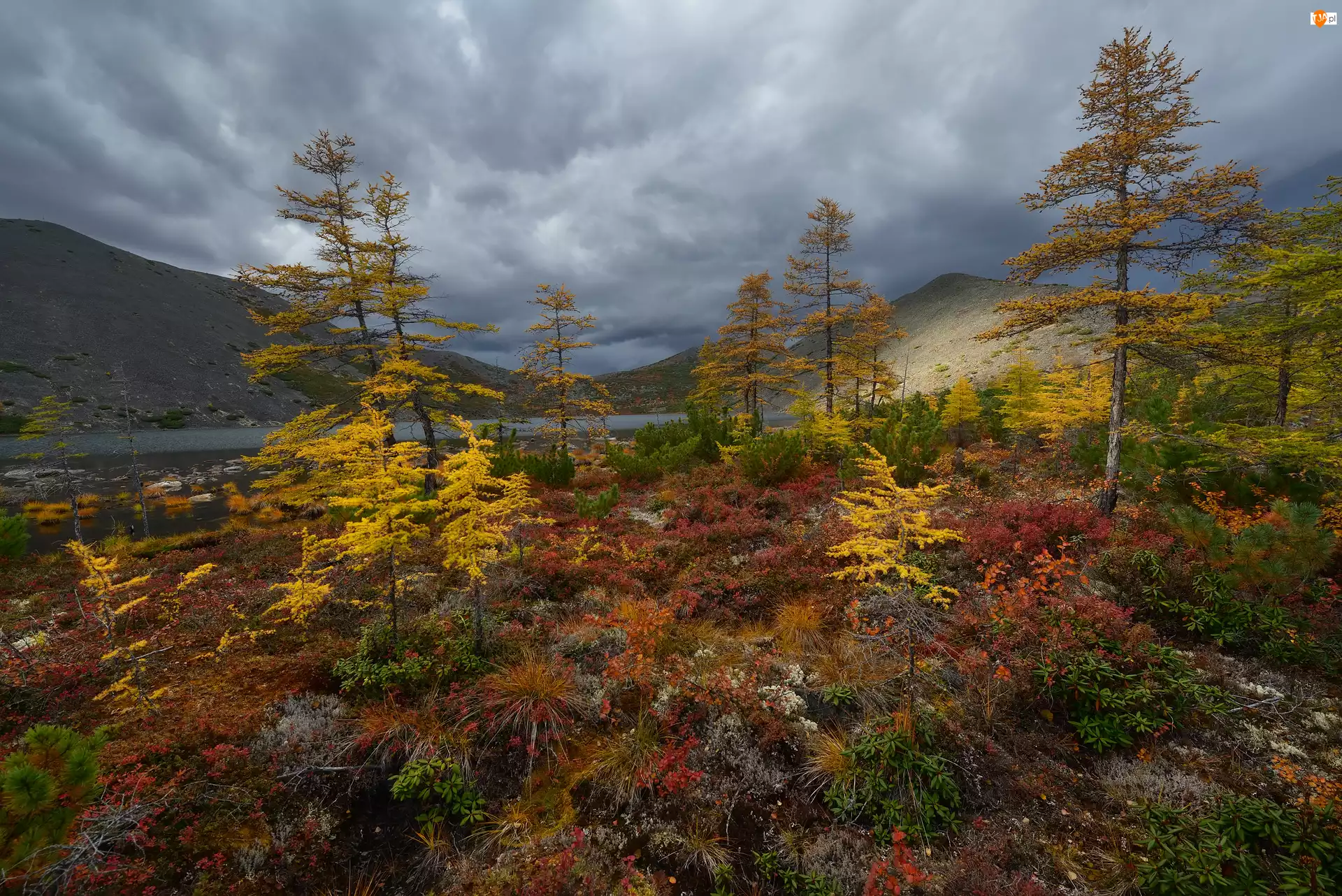 Roślinność, Góry, Kołyma, Chmury, Jezioro, Obwód magadański, Kolorowa, Jesień, Drzewa, Jack London, Rosja