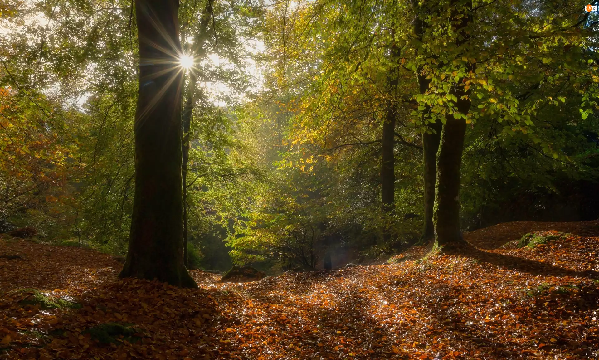 Drzewa, Jesień, Bretania, Francja, Promienie słońca, Huelgoat, Las