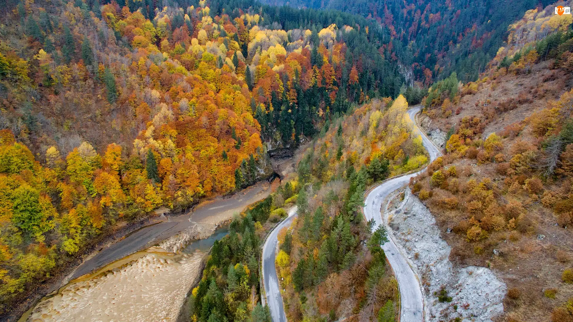 Wzgórza, Jesień, Lasy, Droga, Rzeka, Drzewa