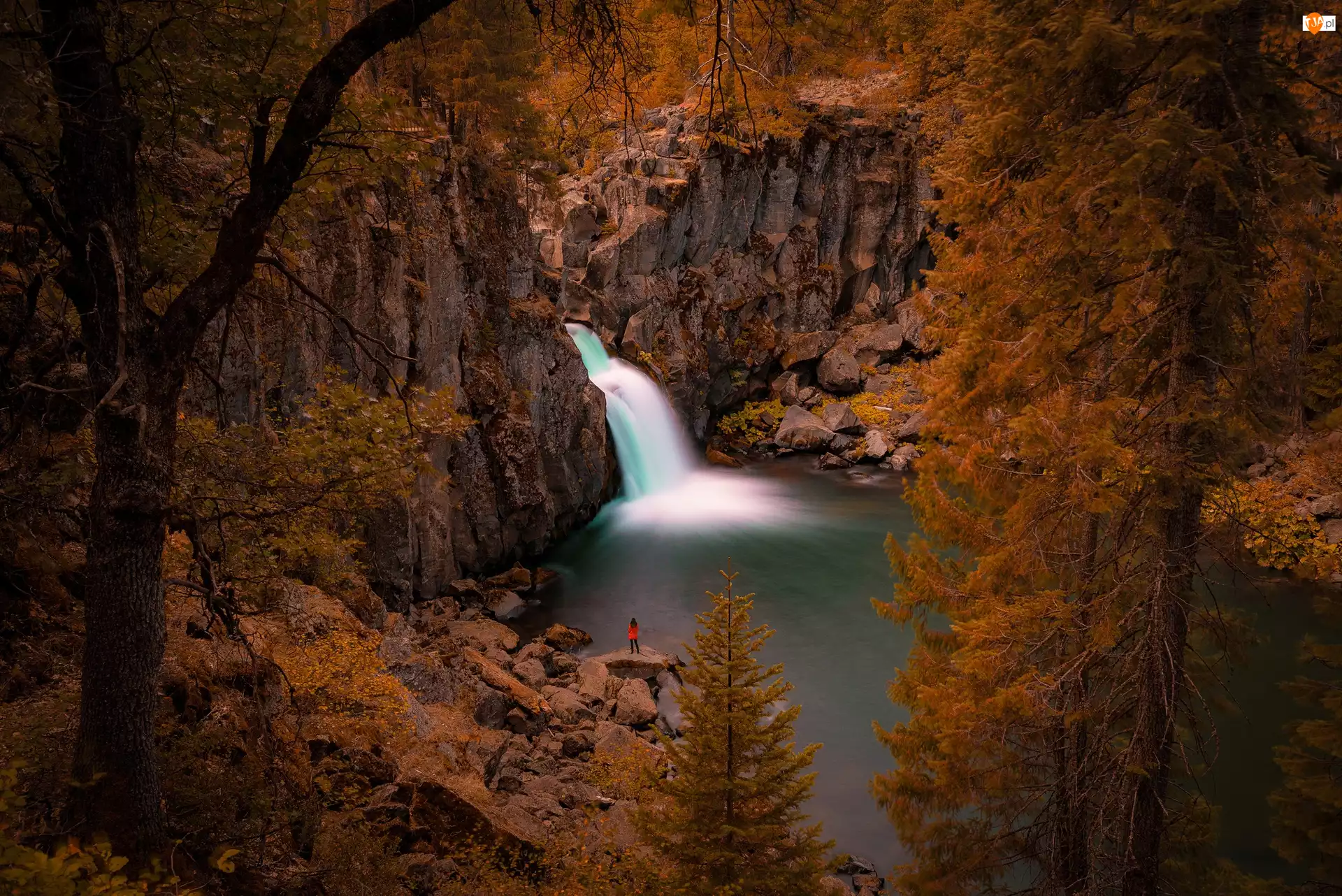 Kobieta, Skały, Drzewa, Wodospad, Jesień