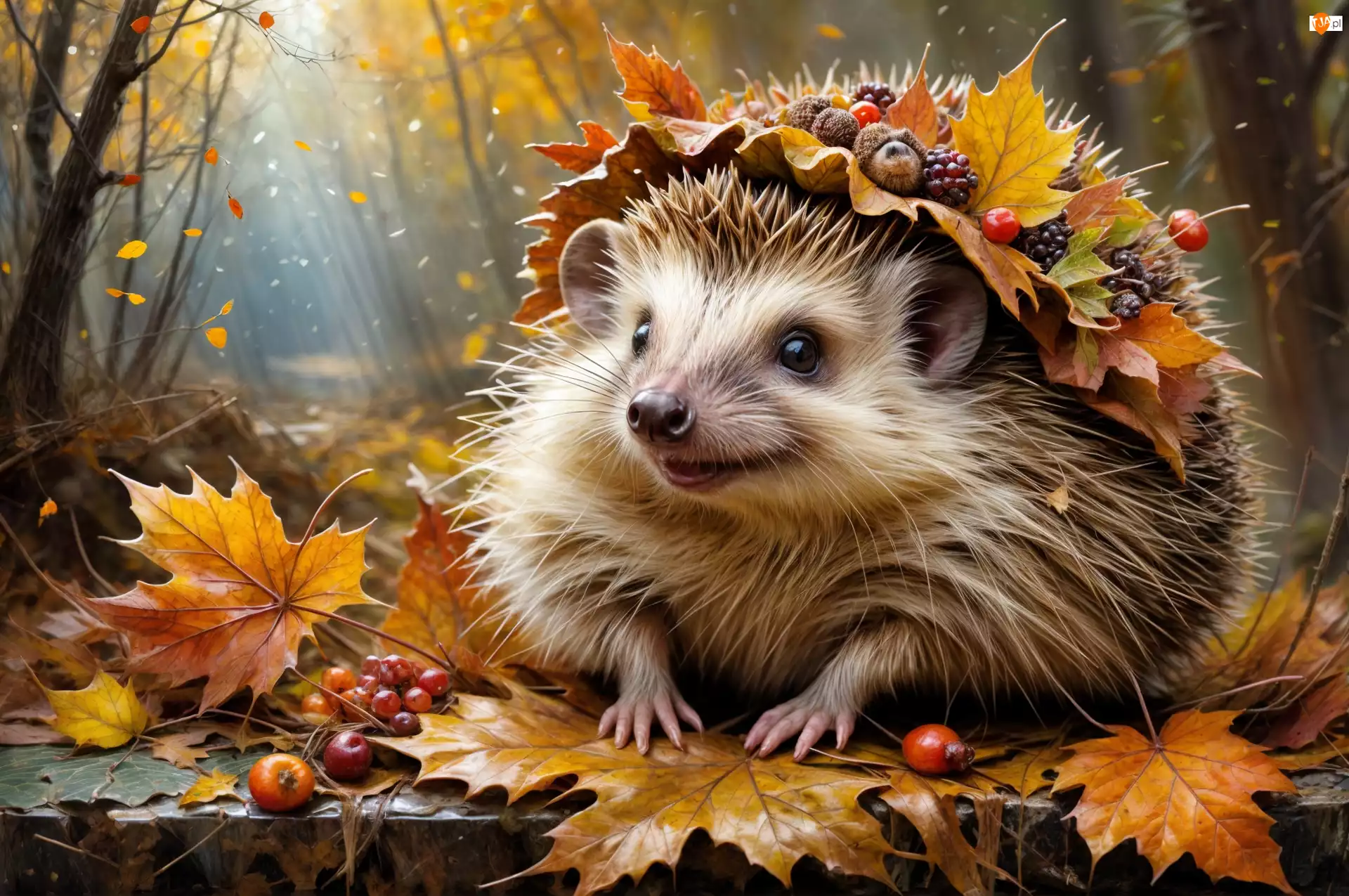 Jeż, Jesień, Żołędzie, Grafika, Liście, Las