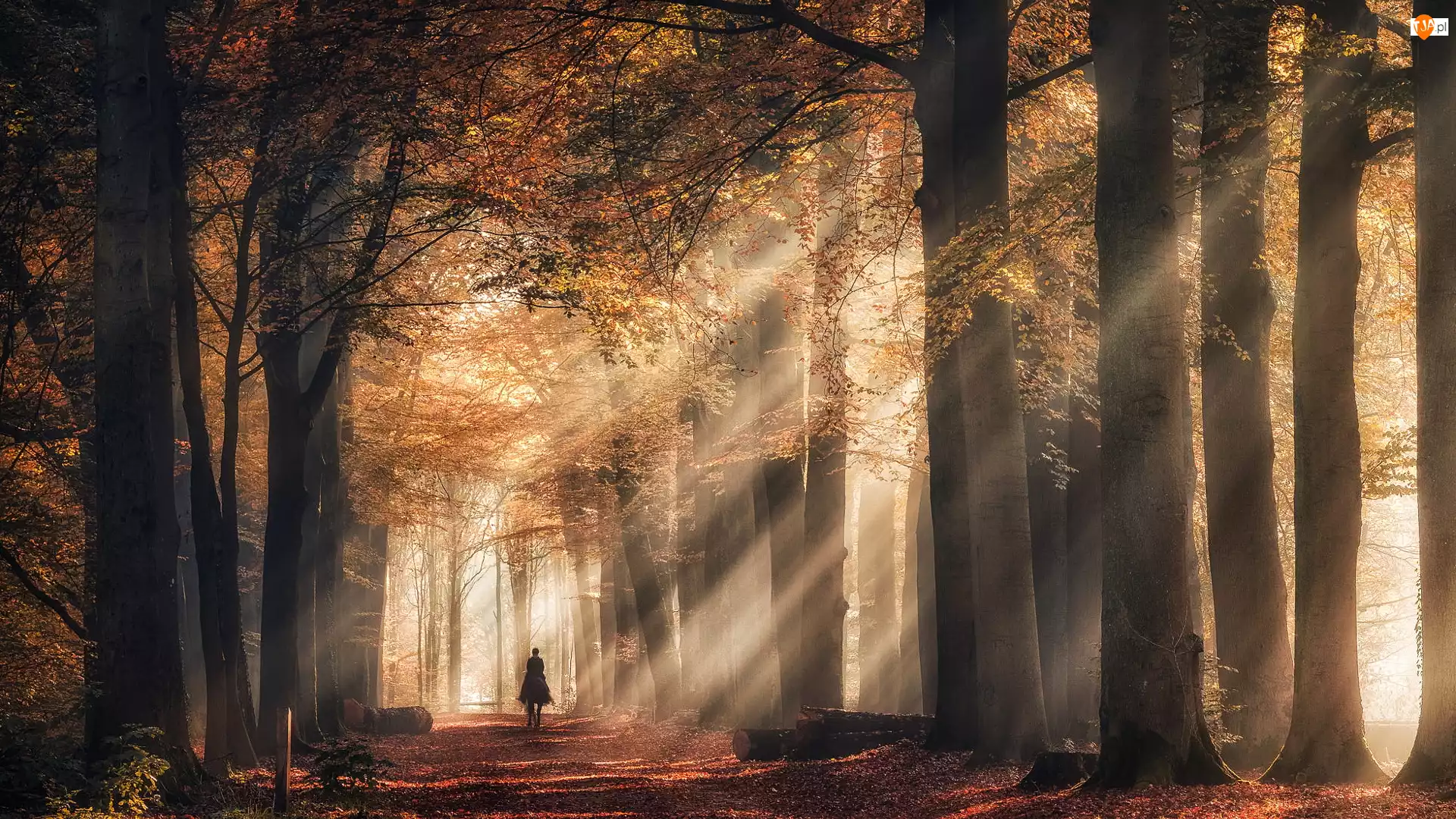 Drzewa, Jesień, Koń, Las, Jeździec, Przebijające światło, Droga