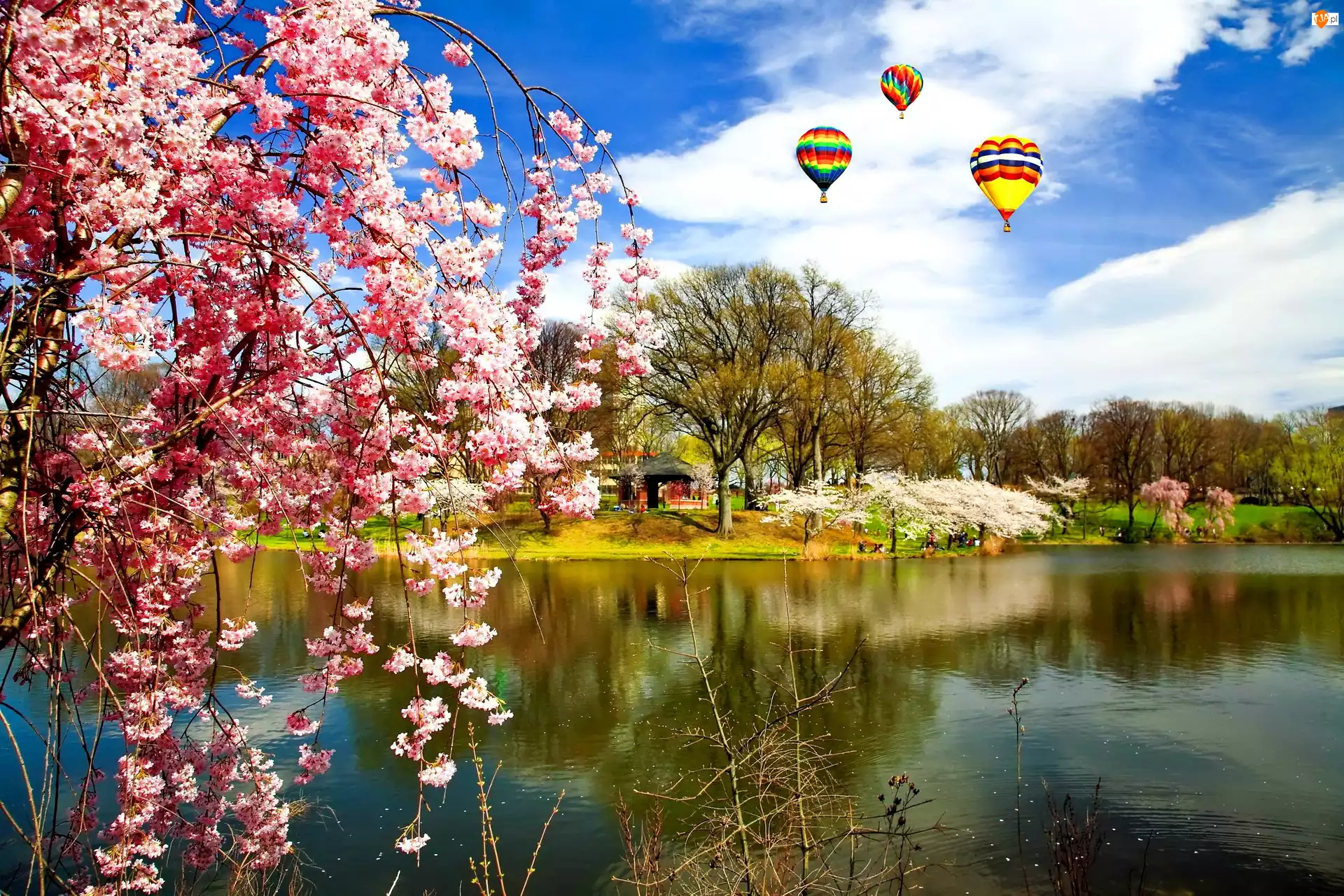 Jezioro, Drzewo, Balony, Kwitnące