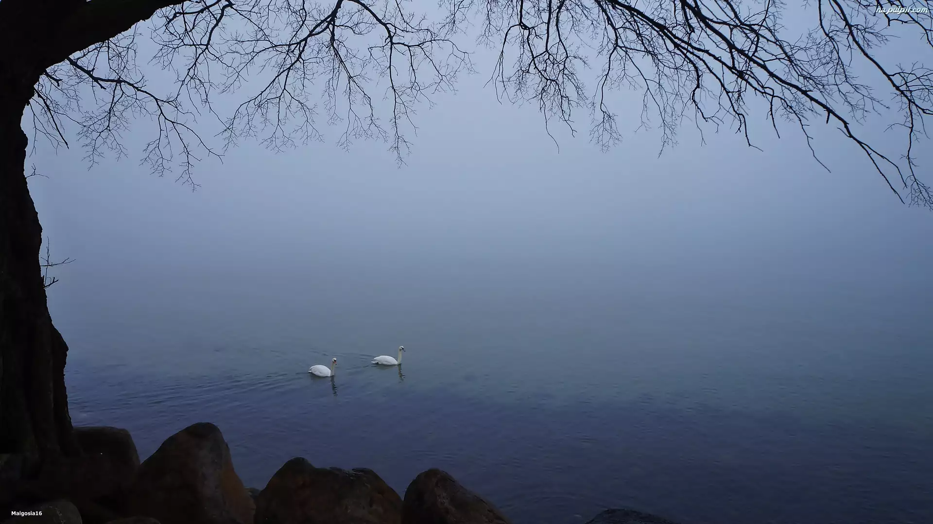 Jezioro, Gałązki, Łabędzie, Drzewo