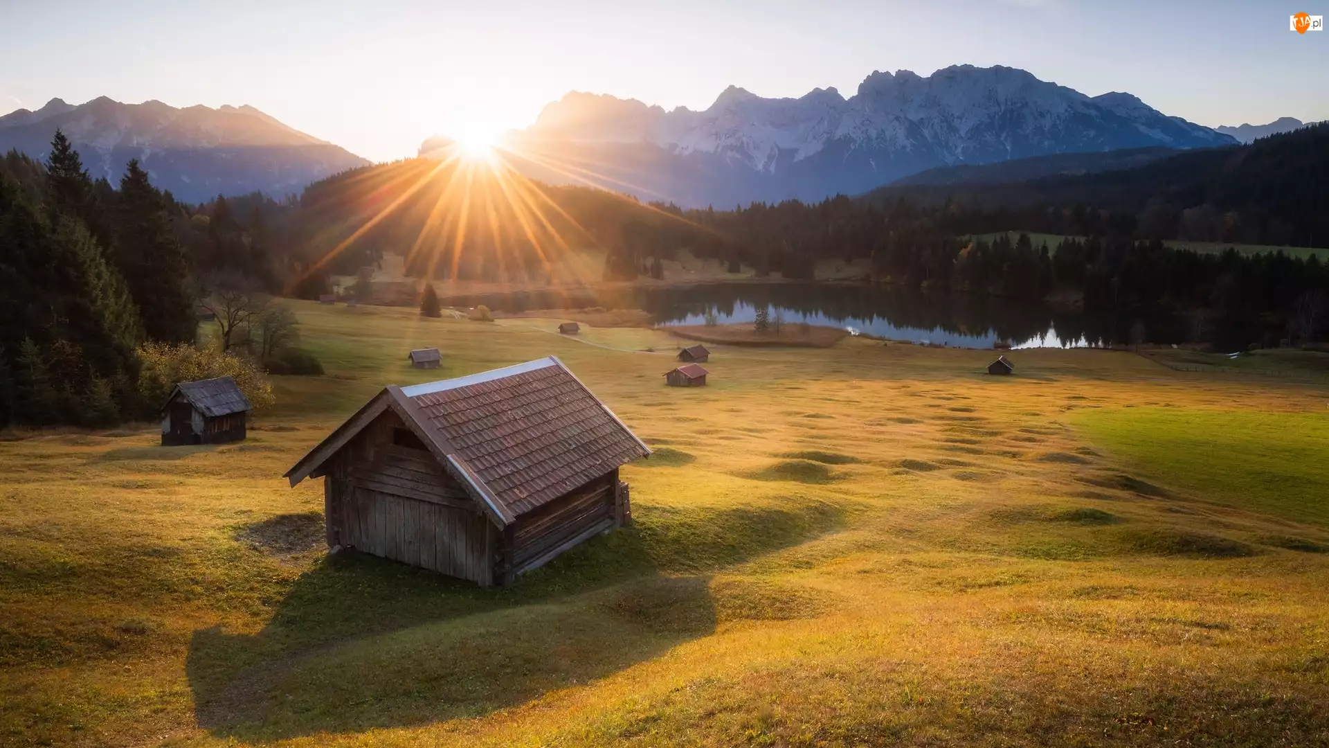 Miejscowość Krun, Las, Dom, Drzewa, Promienie, Bawaria, Jezioro Geroldsee, Wschód słońca, Drewniany, Góry Karwendel, Niemcy