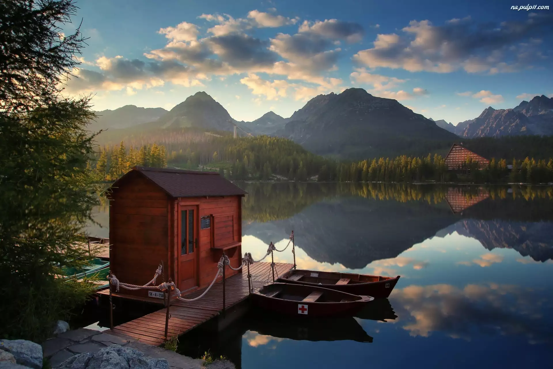 Jezioro, Góry, Domek, Łódki, Przystań, Pomost