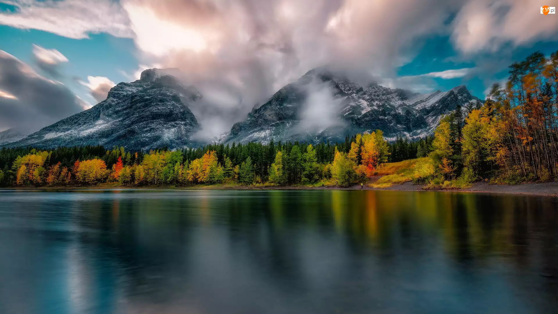 Jezioro, Góry, Drzewa, Chmury, Kolorowe, Jesień