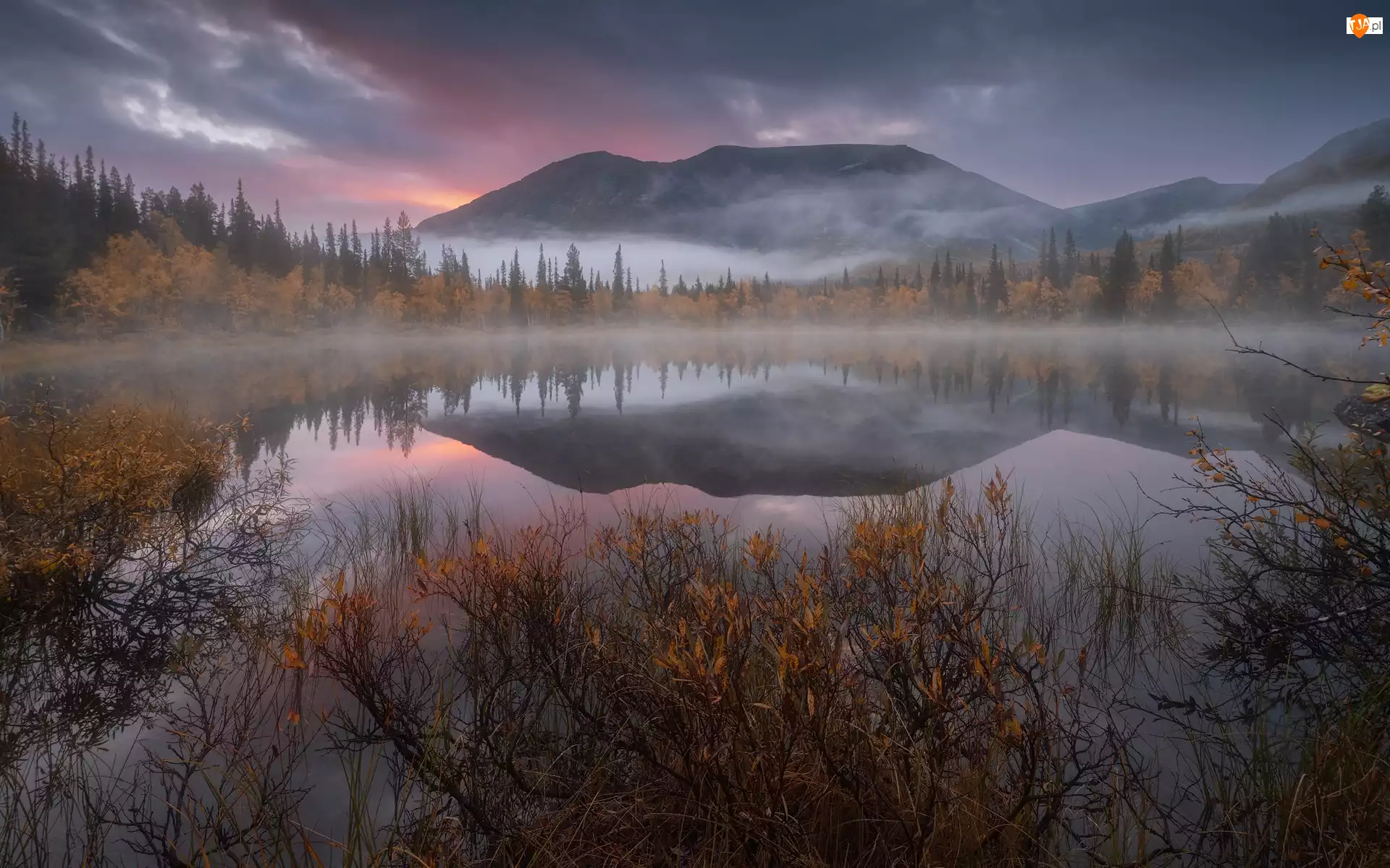 Jezioro, Góry, Krzewy, Odbicie, Drzewa, Mgła