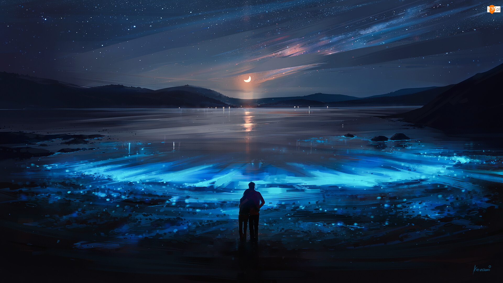 Jezioro, Góry, Księżyc Paintography, Grafika, Noc, Zakochani, Ludzie