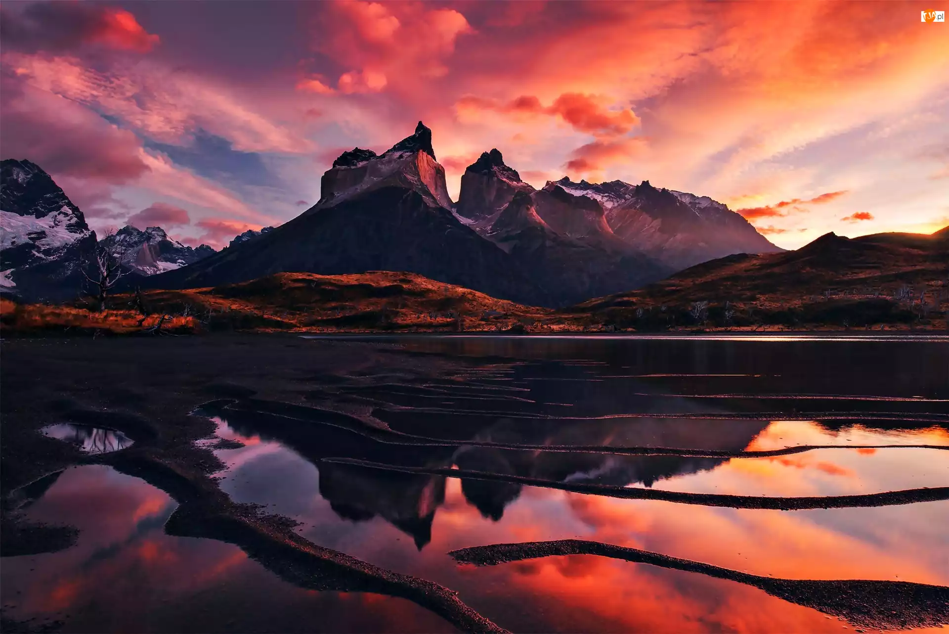 Jezioro, Góry, Zachód, Patagonia, Chmury, Słońca